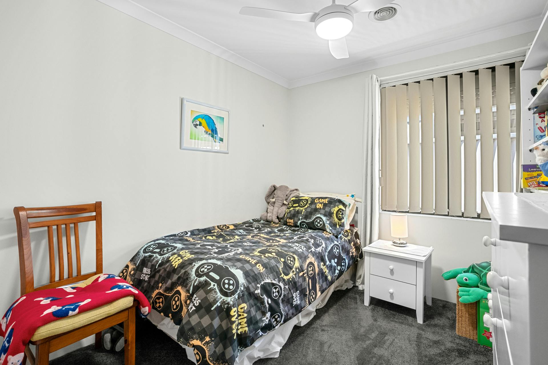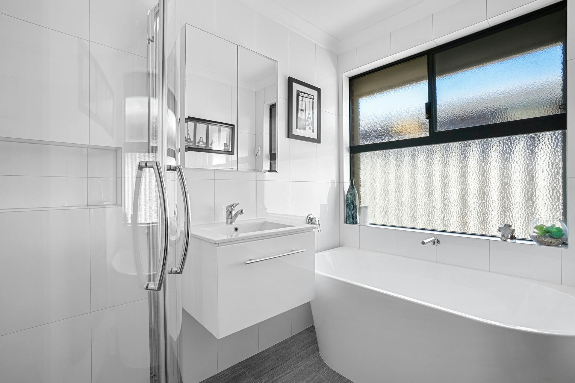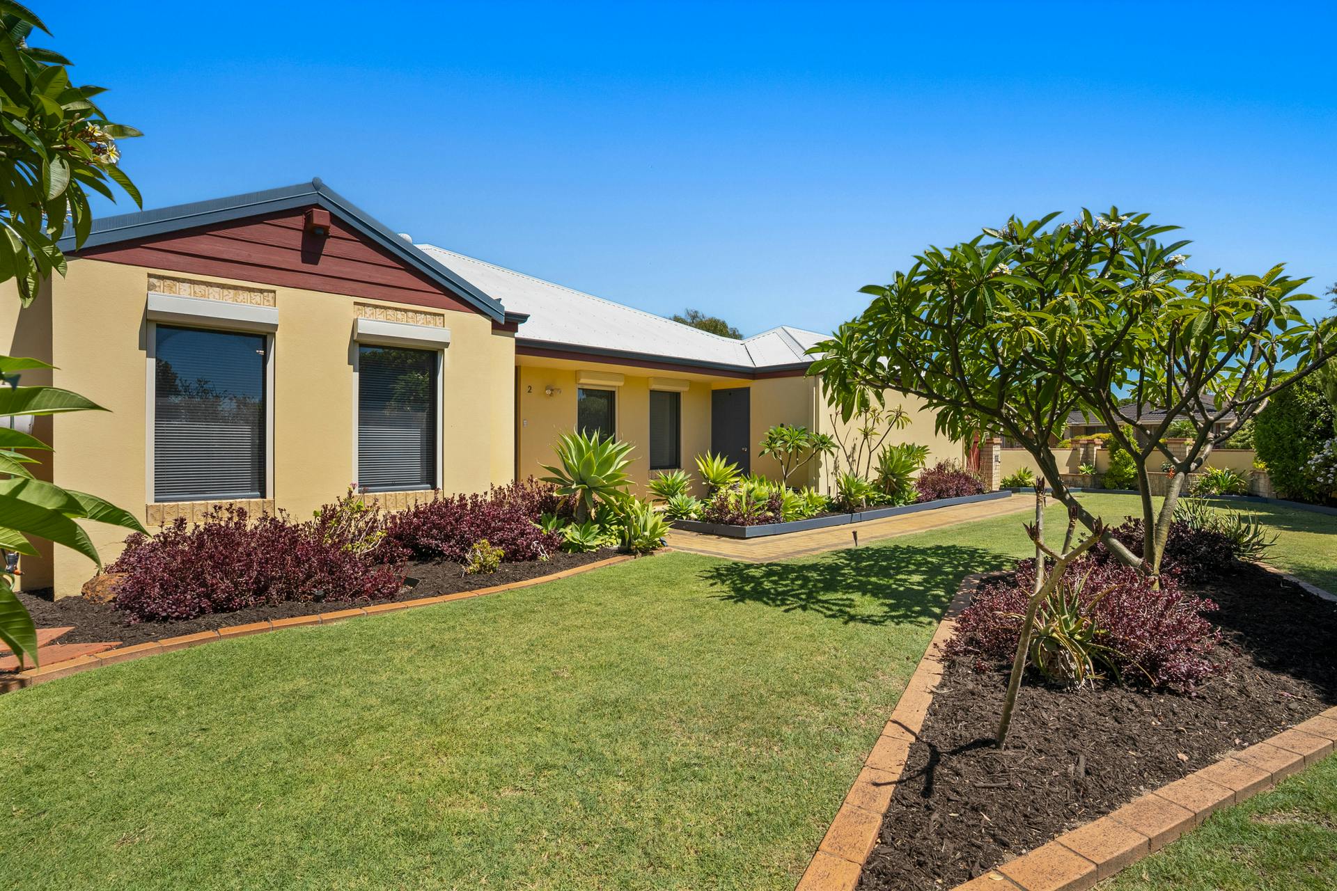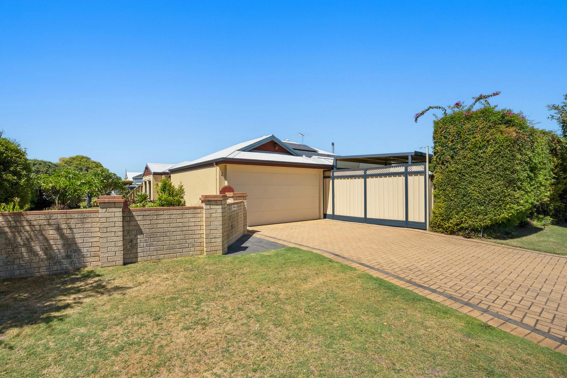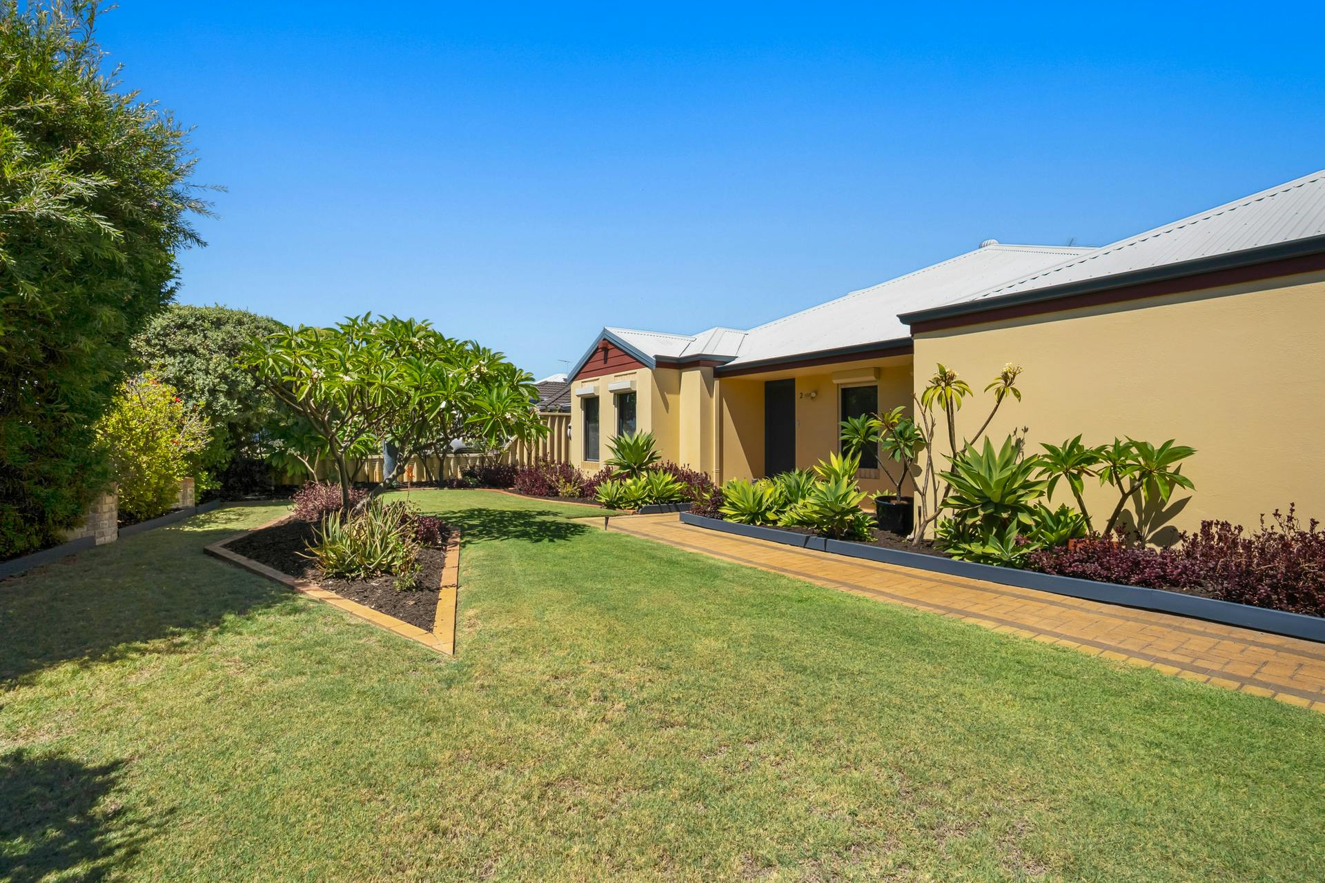 - Fully fenced and lawned backyard with colourful plants, greenery and trees to the border