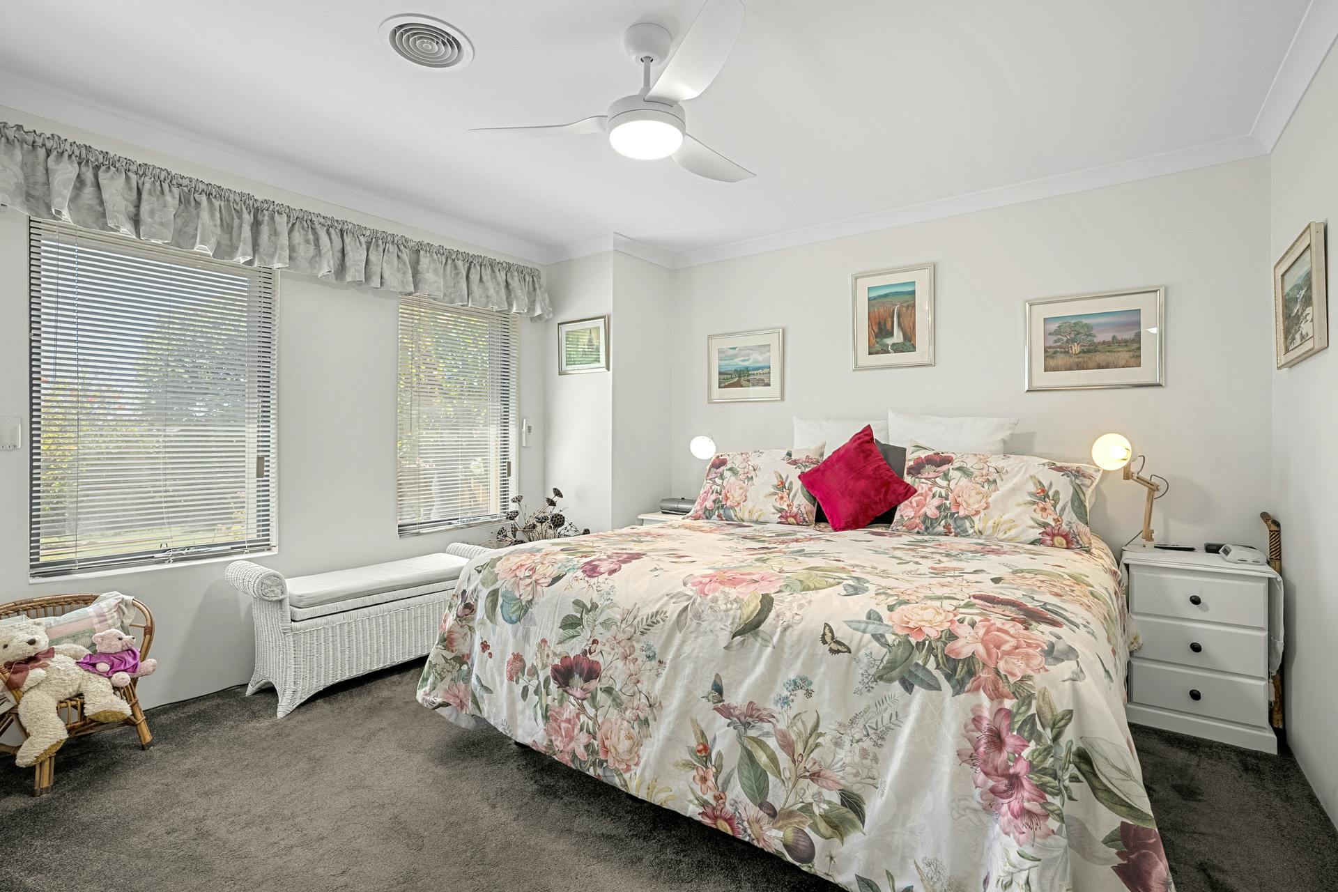 The front garden is completely fenced and gated from the street for a private space to enjoy, with established garden beds and tropical greenery throughout, ensuring an immediate appeal, and a striking first impression that continues across the entire property. A double garage offers secure vehicle parking, while gated access to the side provides an extra height carport for additional recreational storage, with a pathway leading to your sheltered entry within the home. Your master suite is placed to the left, with carpet underfoot, a cooling ceiling fan and walk-in robe, while the renovated ensuite is fully tiled, with a shower enclosure with glass screening, a vanity and WC. Your generous formal lounge or theatre space sits opposite and is also carpeted, with garden views and an open flow to the main living area beyond, while the home office or potential 5th bedroom provides built-in storage and natural lighting within.