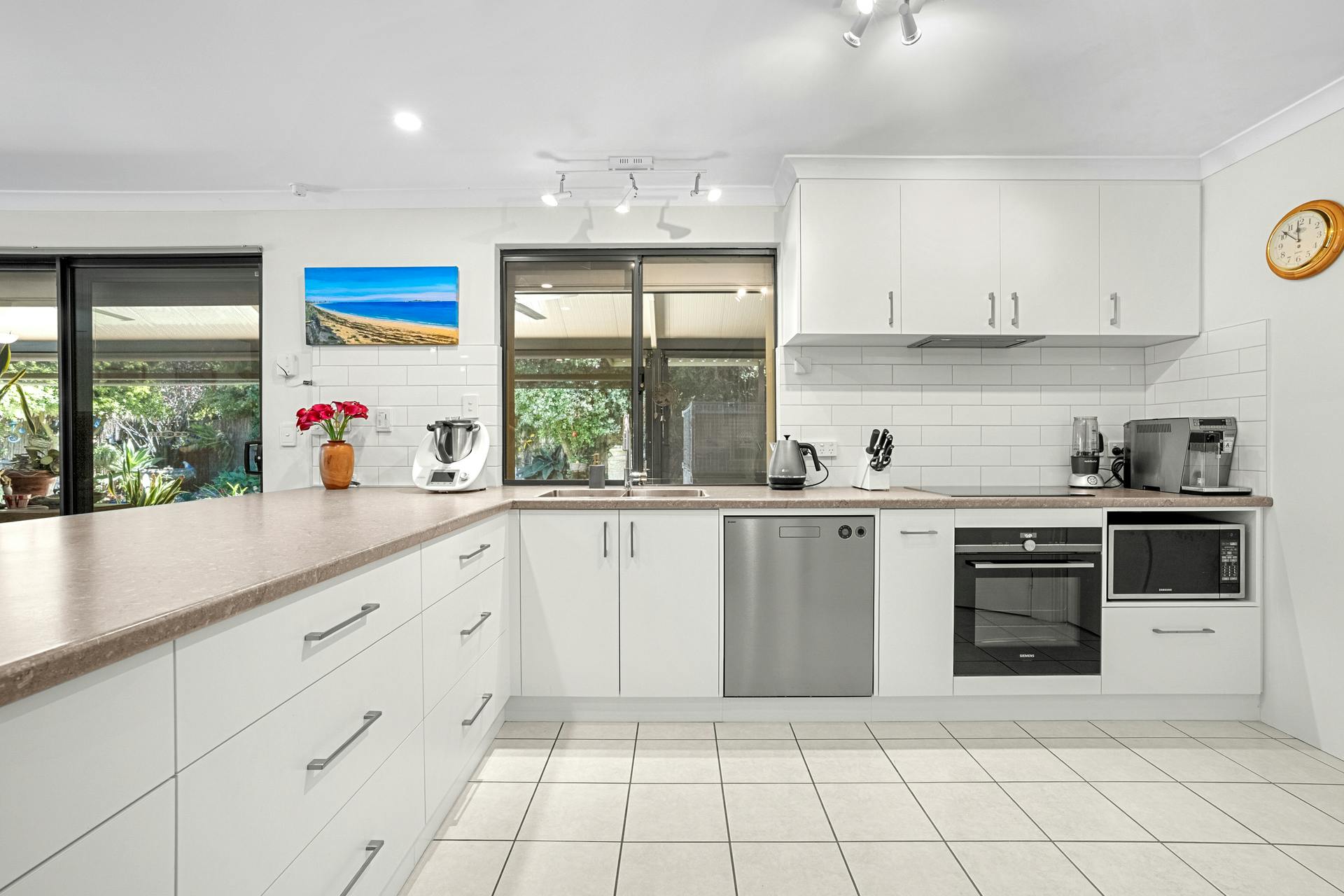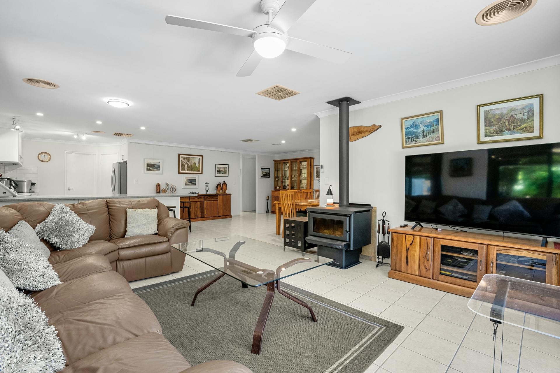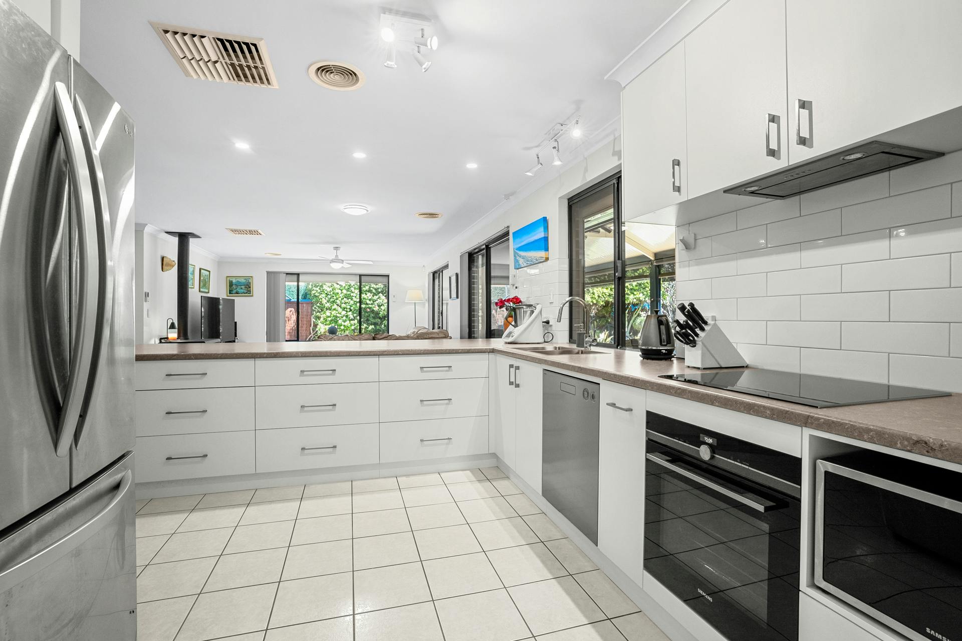 Your three minor bedrooms all benefit from ceiling fans and built-in double robes, with the updated bathroom between, including that same large format tiling, with a shower enclosure with in-built recess, plus both a bath and floating vanity. Your main family zone provides a sweeping area to rest and relax, with tiled flooring and plenty of space for a multitude of layouts and uses, with a warming wood fire and cooling ceiling fan for comfort. Your kitchen is again renovated throughout, with a substantial breakfast bar design, while crisp white cabinetry ensures ample storage, and quality in-built appliances add to its appeal, with an electric oven and induction cooktop. Your gabled roof alfresco is reached via sliding doors and is insulated for year round well-being, with café blinds and exterior fans for the ultimate space to gather, with paved flooring and uninterrupted views to the spectacular garden beyond.