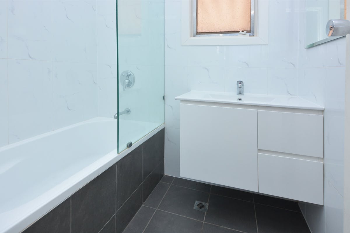 Modern renovated bathroom with shower over bath