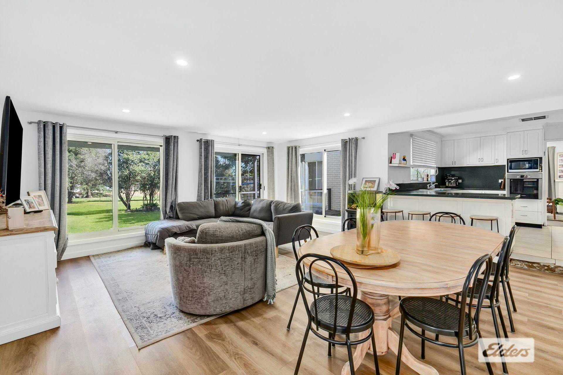 At the heart of the home, the living and dining areas flow seamlessly to a superb outdoor entertaining zone, creating the perfect setting for gatherings with family and friends while overlooking the expansive grounds.