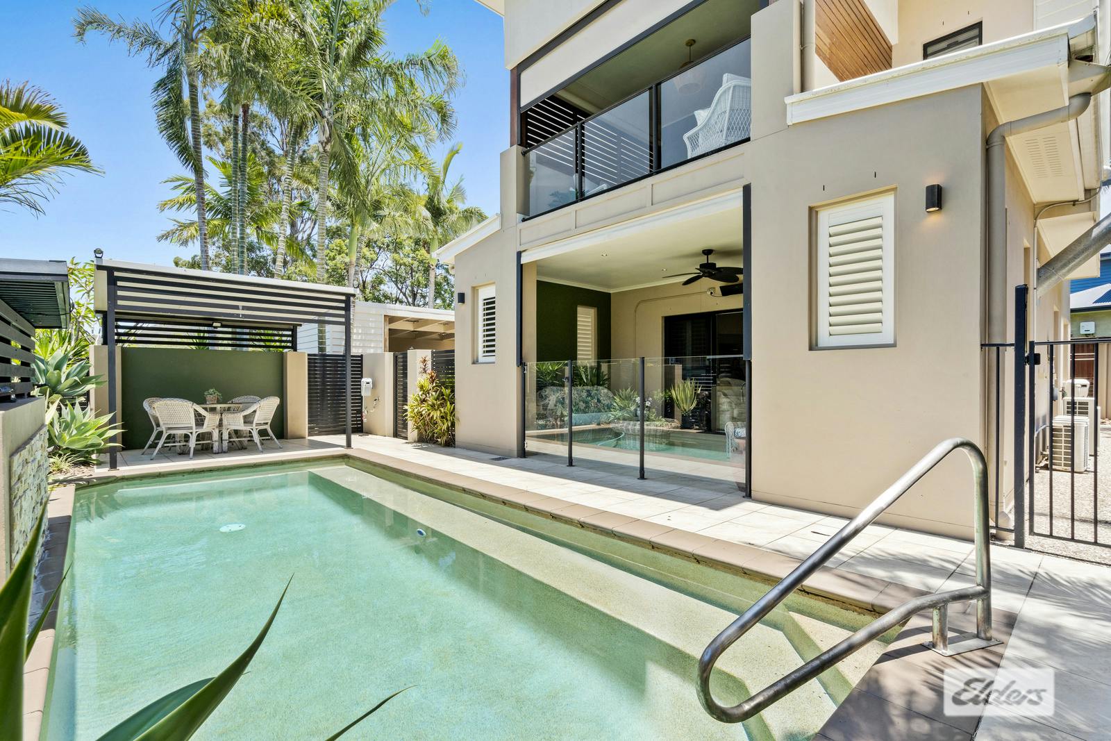 *Alfresco entertaining area with privacy blinds and outdoor kitchen, overlooking the saltwater inground pool and outdoor lounge/cabana