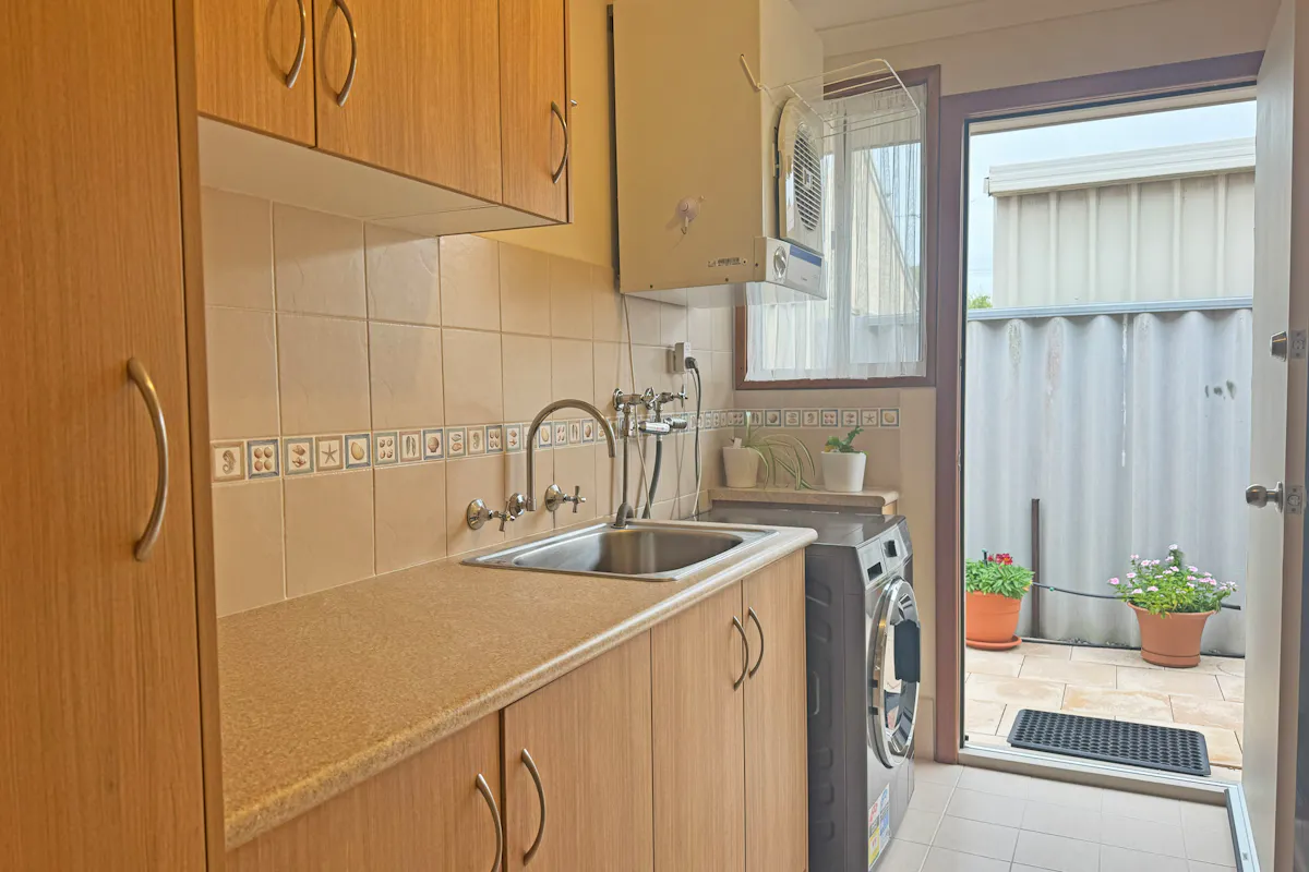 - Laundry, tiled floor, built-in storage with linen press, benchtop with trough and overhead cupboards, door to side yard