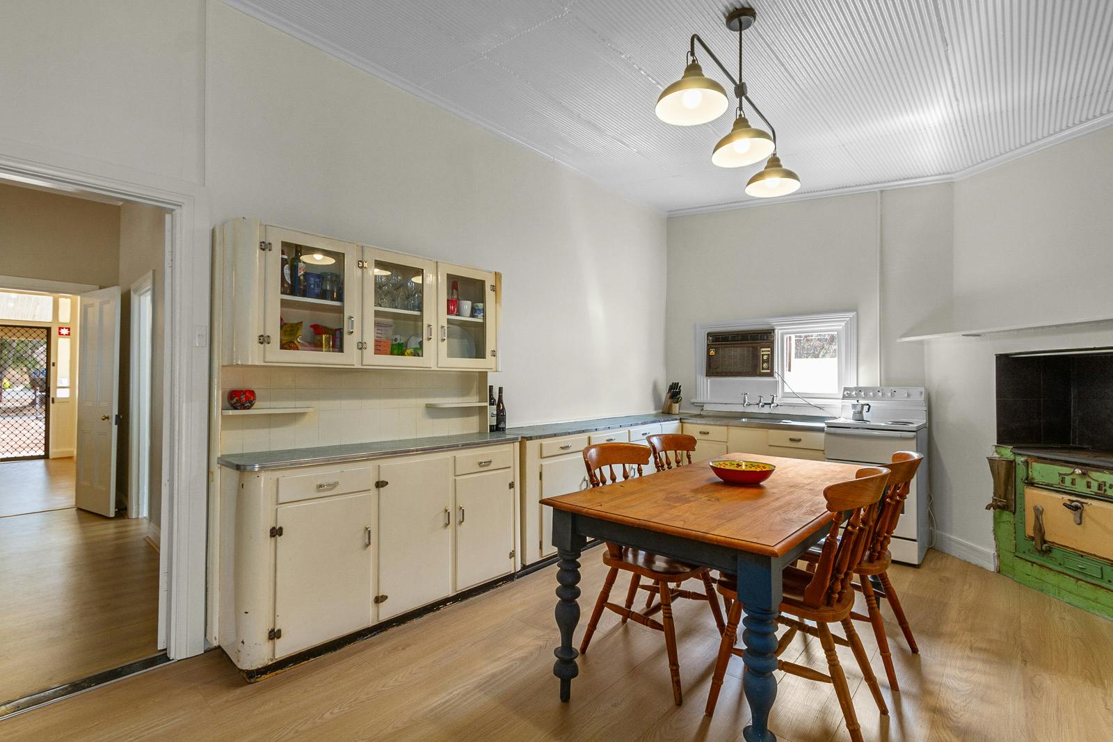 At the centre of the home is a comfortable living area, complete with a slow combustion heater installed within the original fireplace – perfect for cosy winter evenings. This space flows through to the family eat-in kitchen, which features a charming retro design, generous bench space, ample storage and the original wood stove, adding to the home's character.