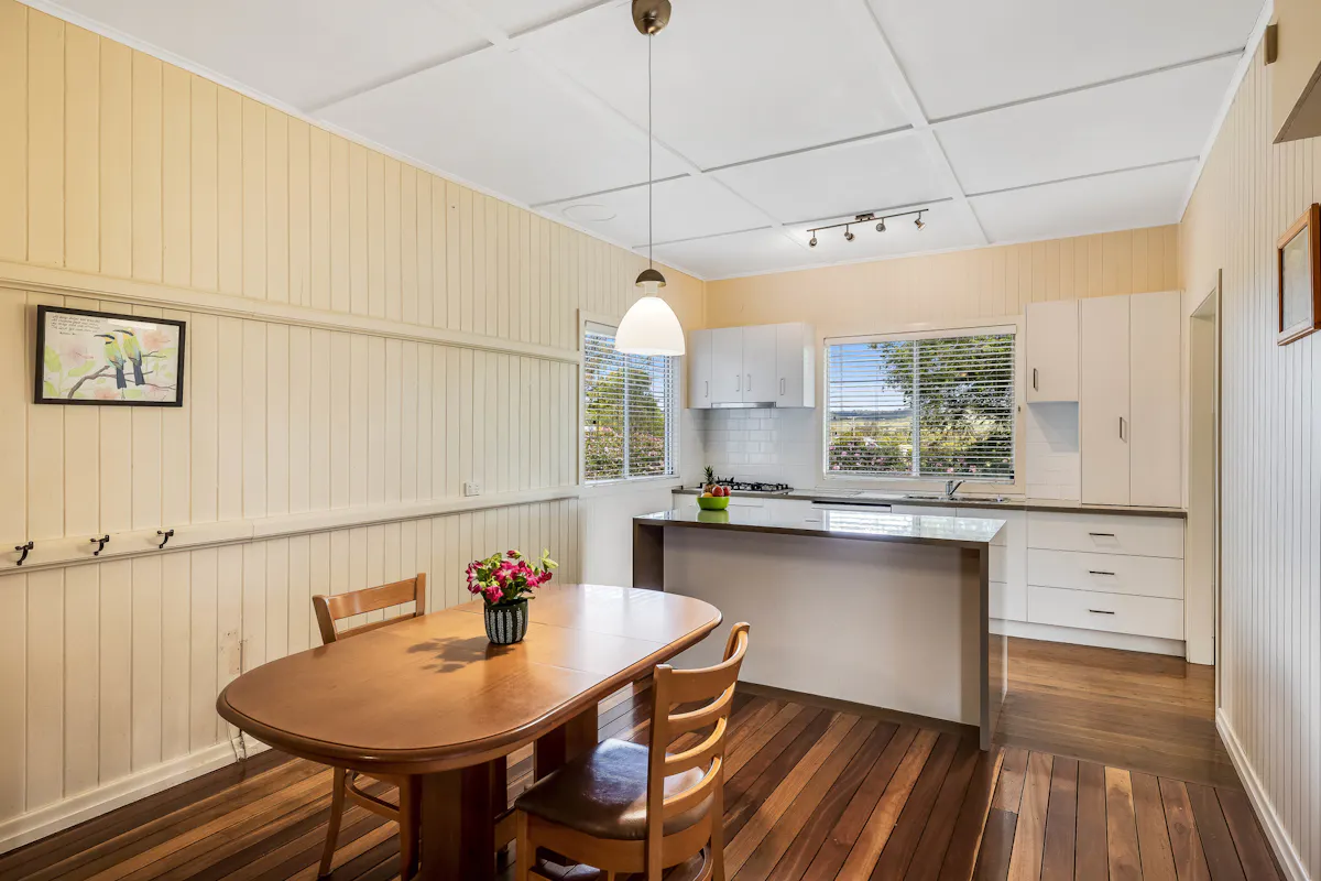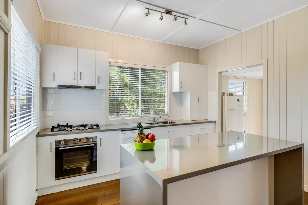 Update kitchen with island bench and large gas cook top, dishwasher, plenty of storage and pantry.