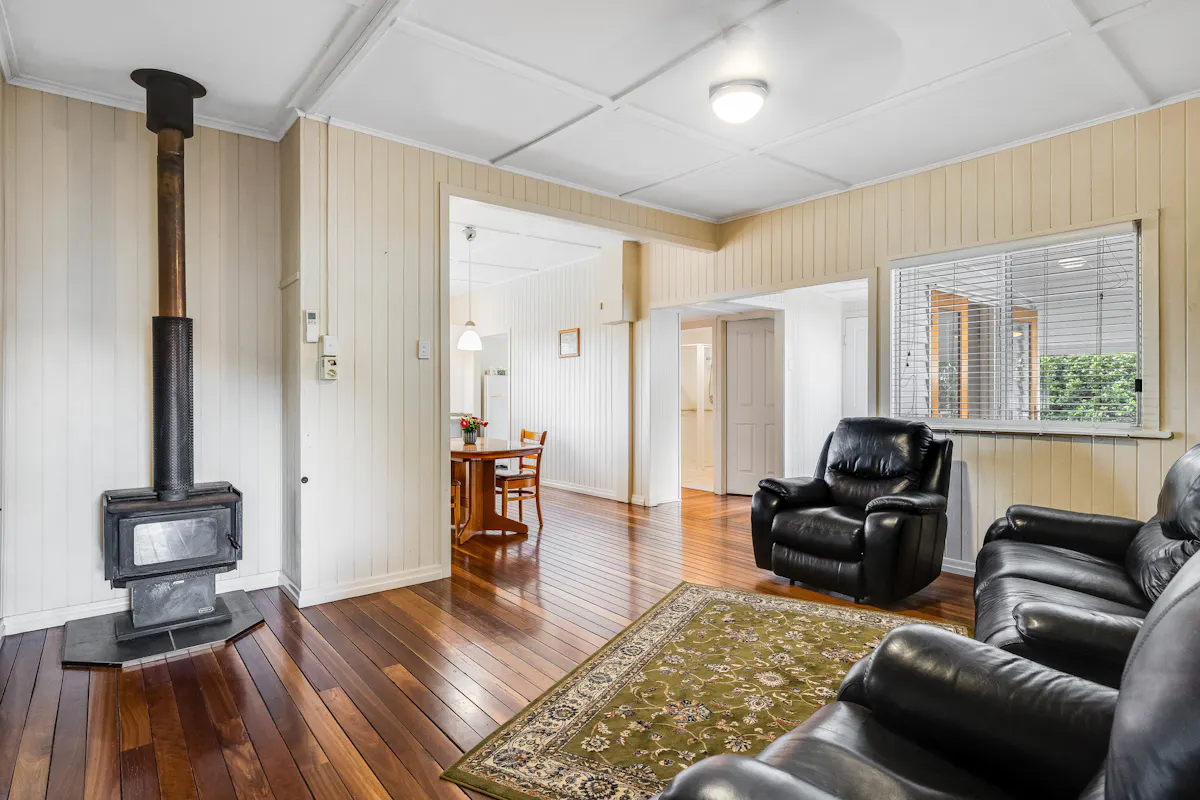 Open plan dining and lounge room with reverse cycle air-conditioning and wood heater