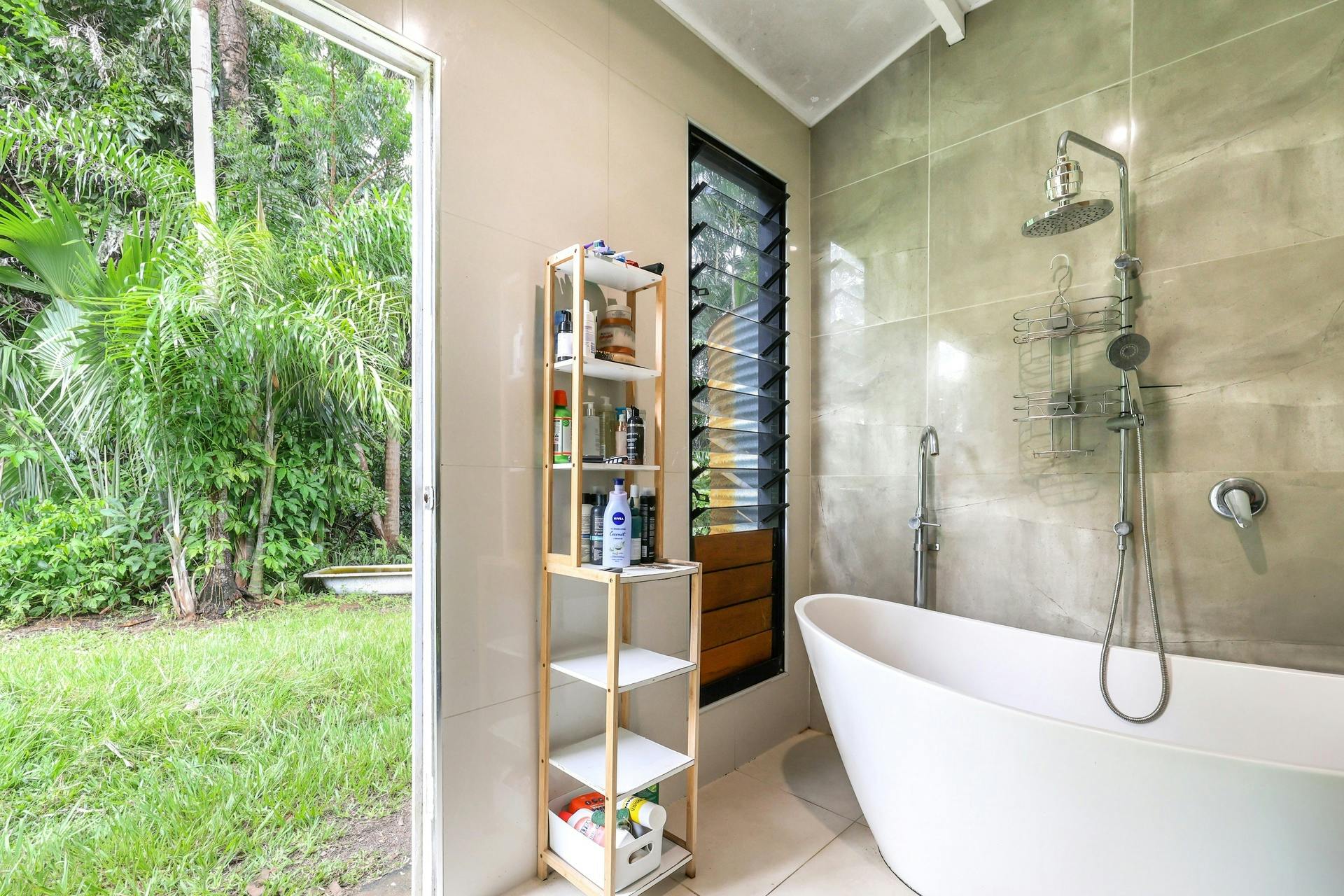 The second dwelling is a ground-level, two-bedroom home complete with a spacious in-ground swimming pool with shade sail, side carport parking for two vehicles and a rainwater tank. Inside, there is a central living and dining area with kitchenette, plus a bathroom featuring a freestanding bathtub with peaceful views over the rear paddock.