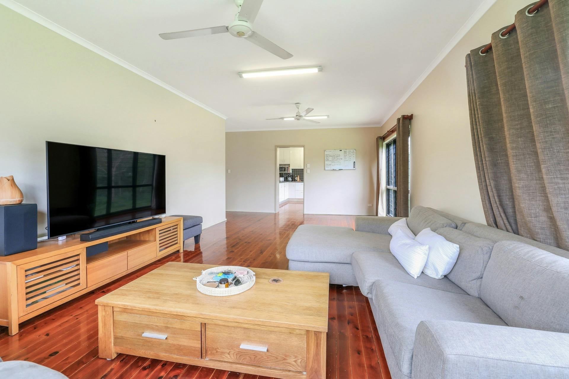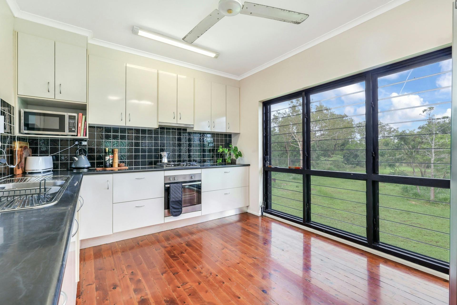 The main residence is elevated and features three upstairs bedrooms, all enjoying views across the paddocks. A supersized living area provides plenty of room for the whole family, while the kitchen boasts a striking wall of windows overlooking the property below, filling the space with natural light.