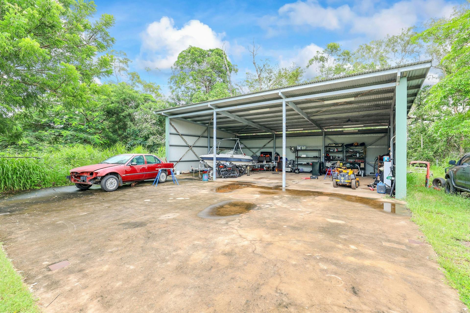 At the back of the block, a second workshop shed provides open-faced parking ideal for a tractor, tools, or extra storage.