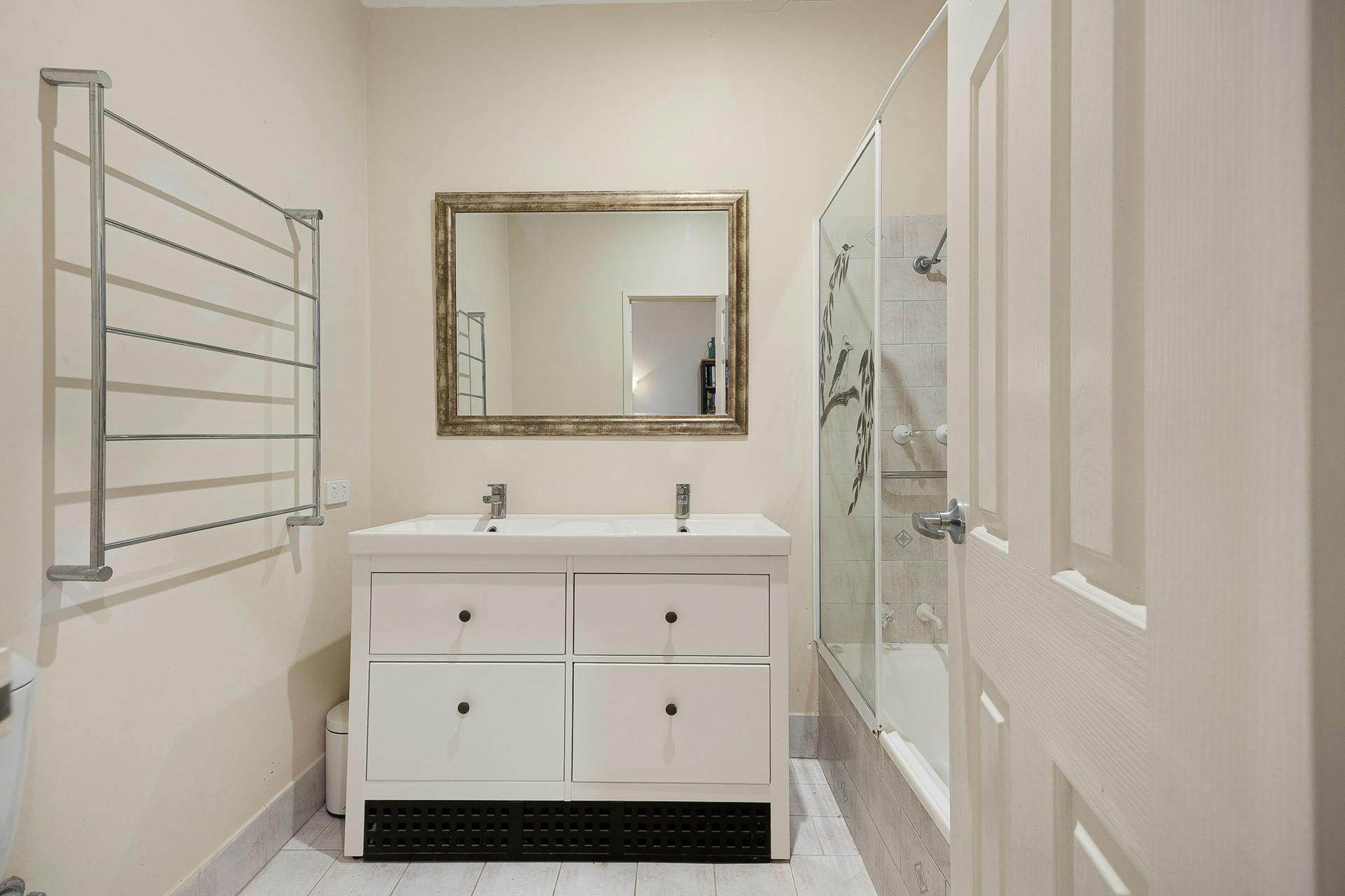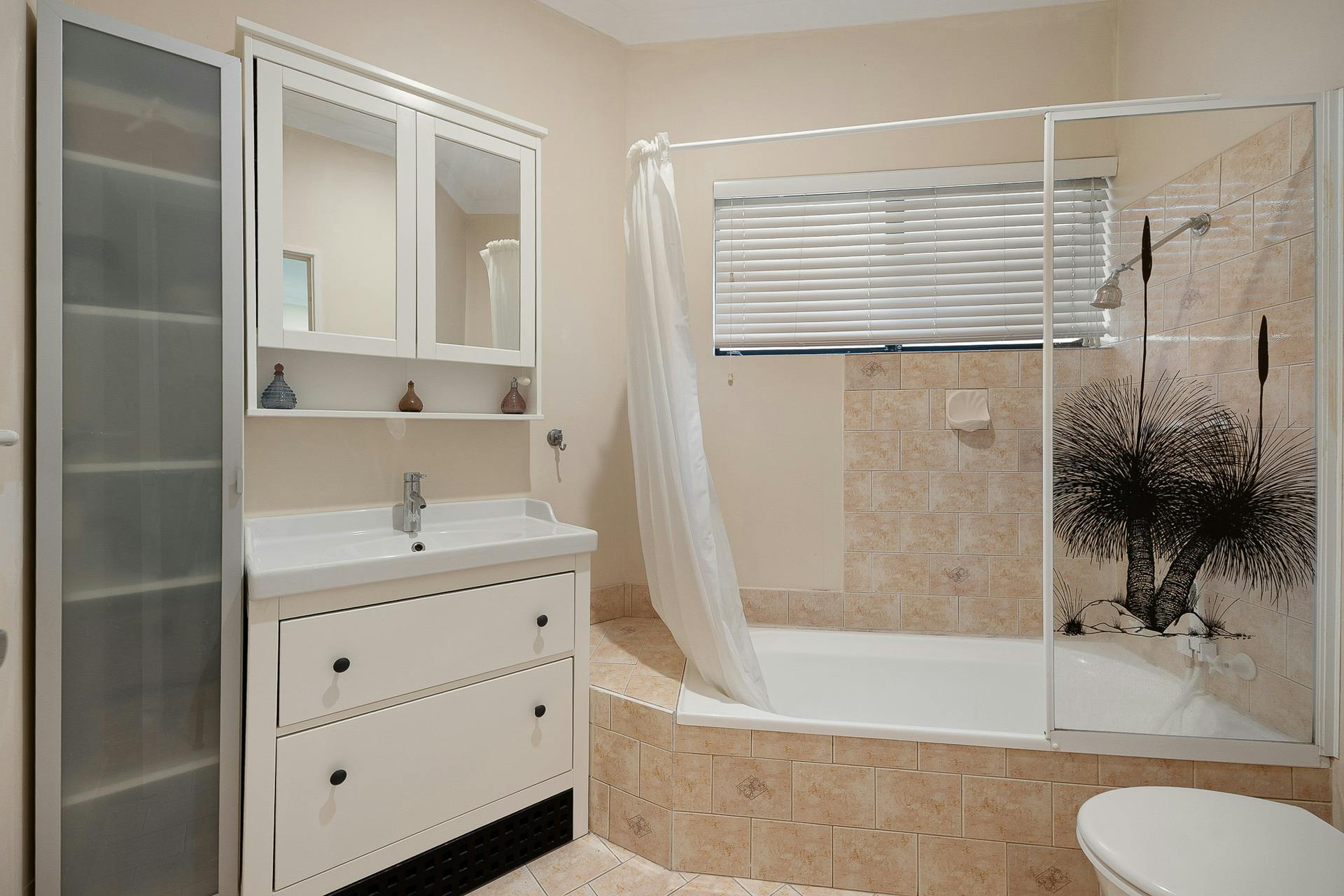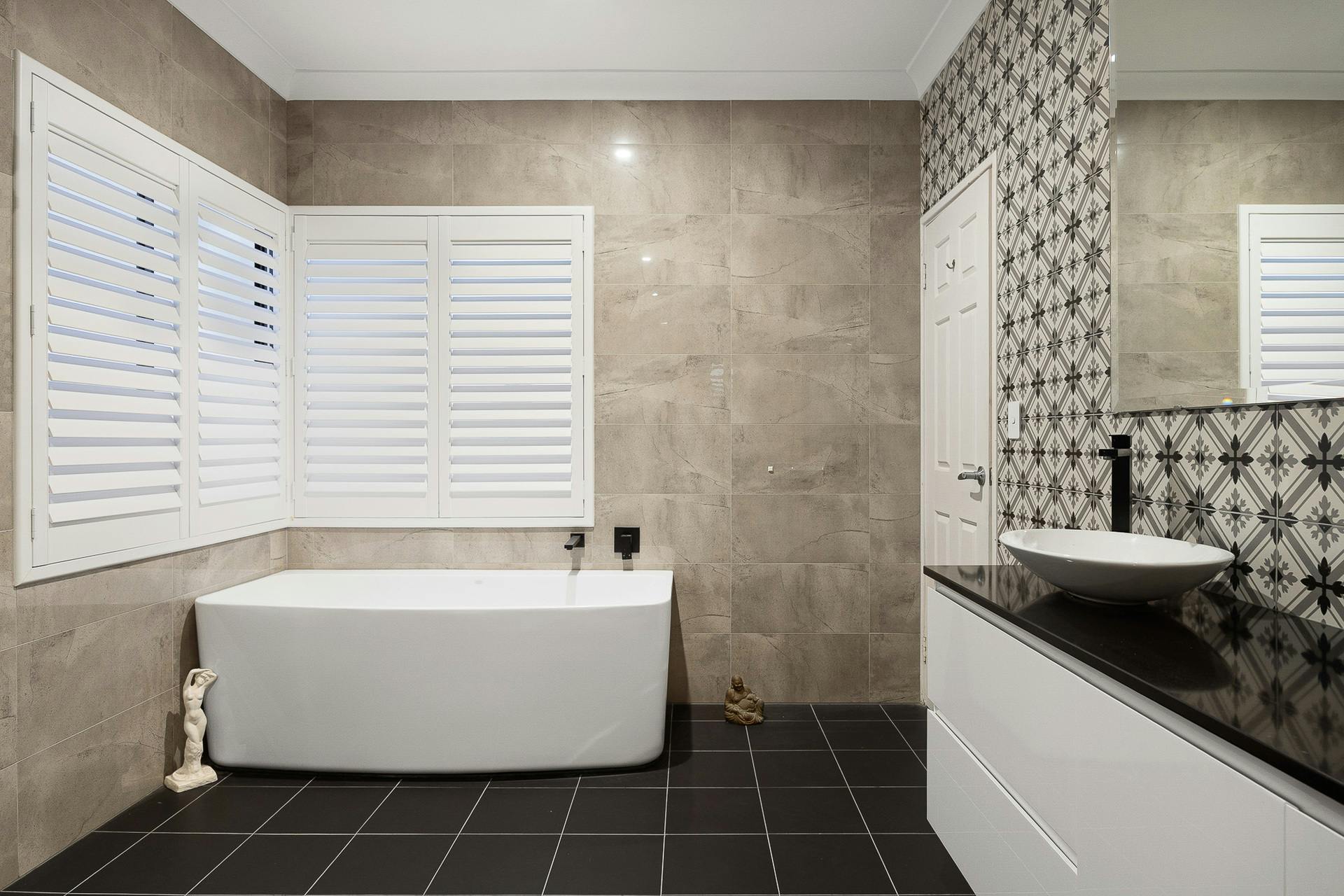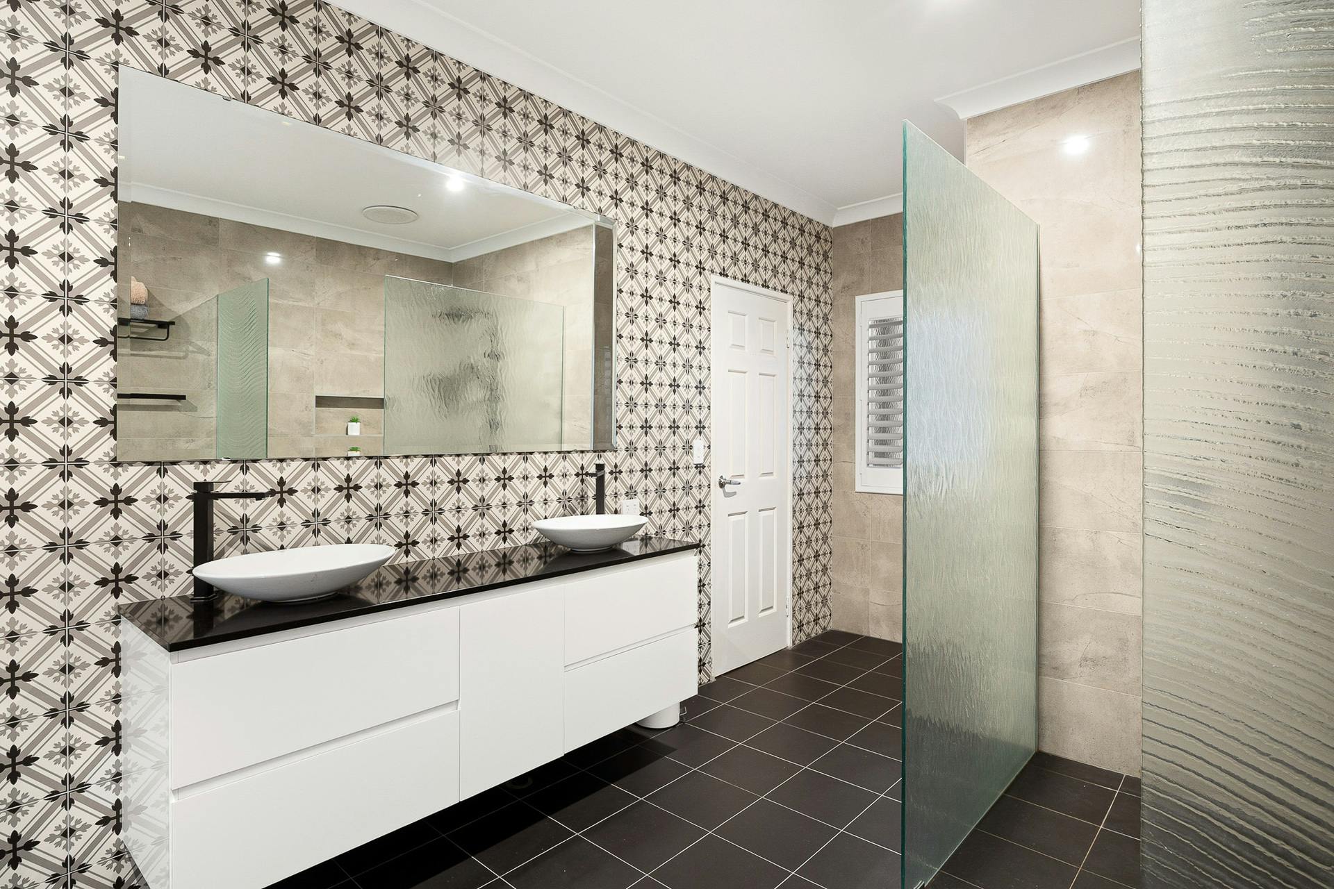 - Generous ensuite to primary bedroom, with floor to ceiling tiling, a dual vanity, bathtub and walk-in shower with feature glass screening