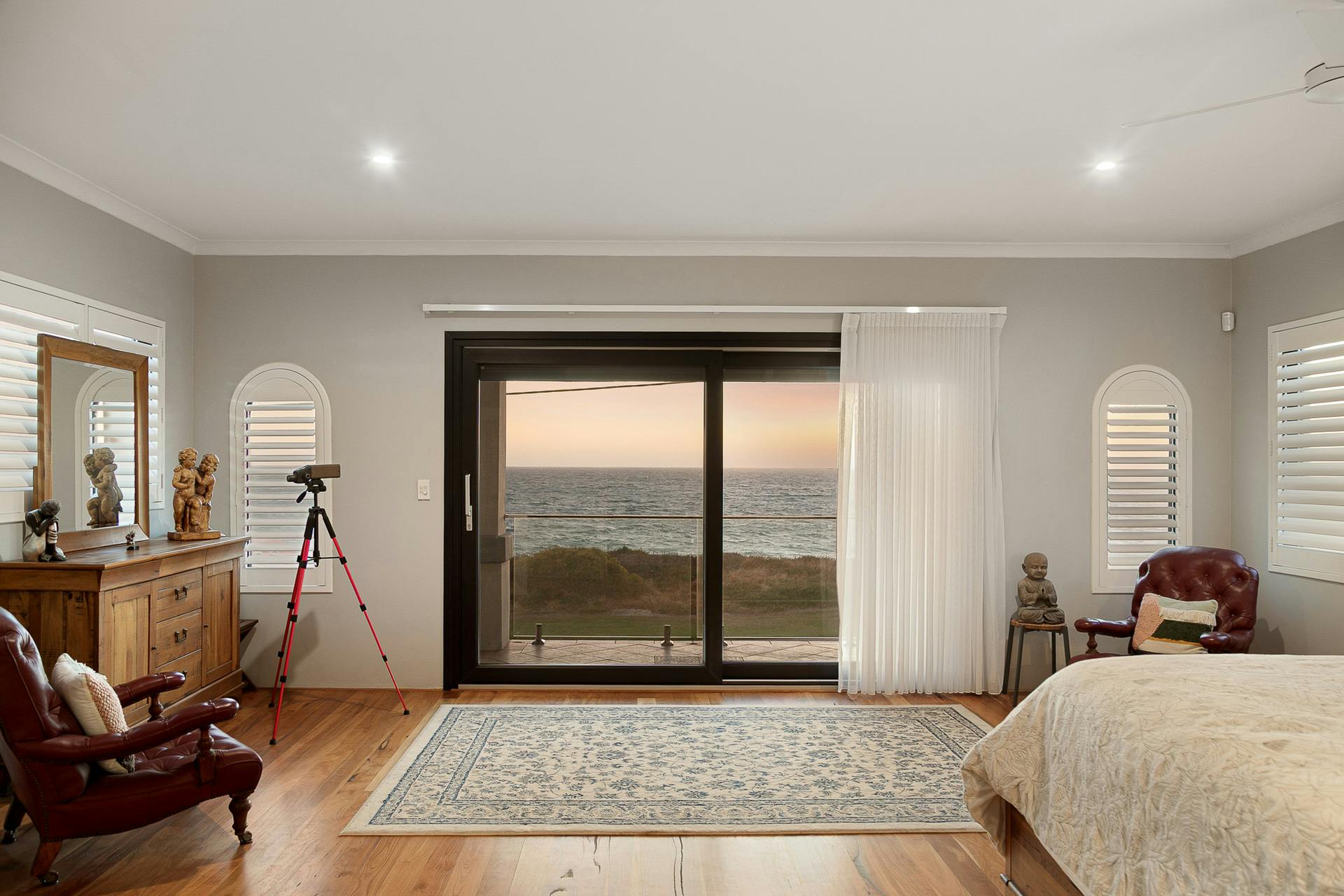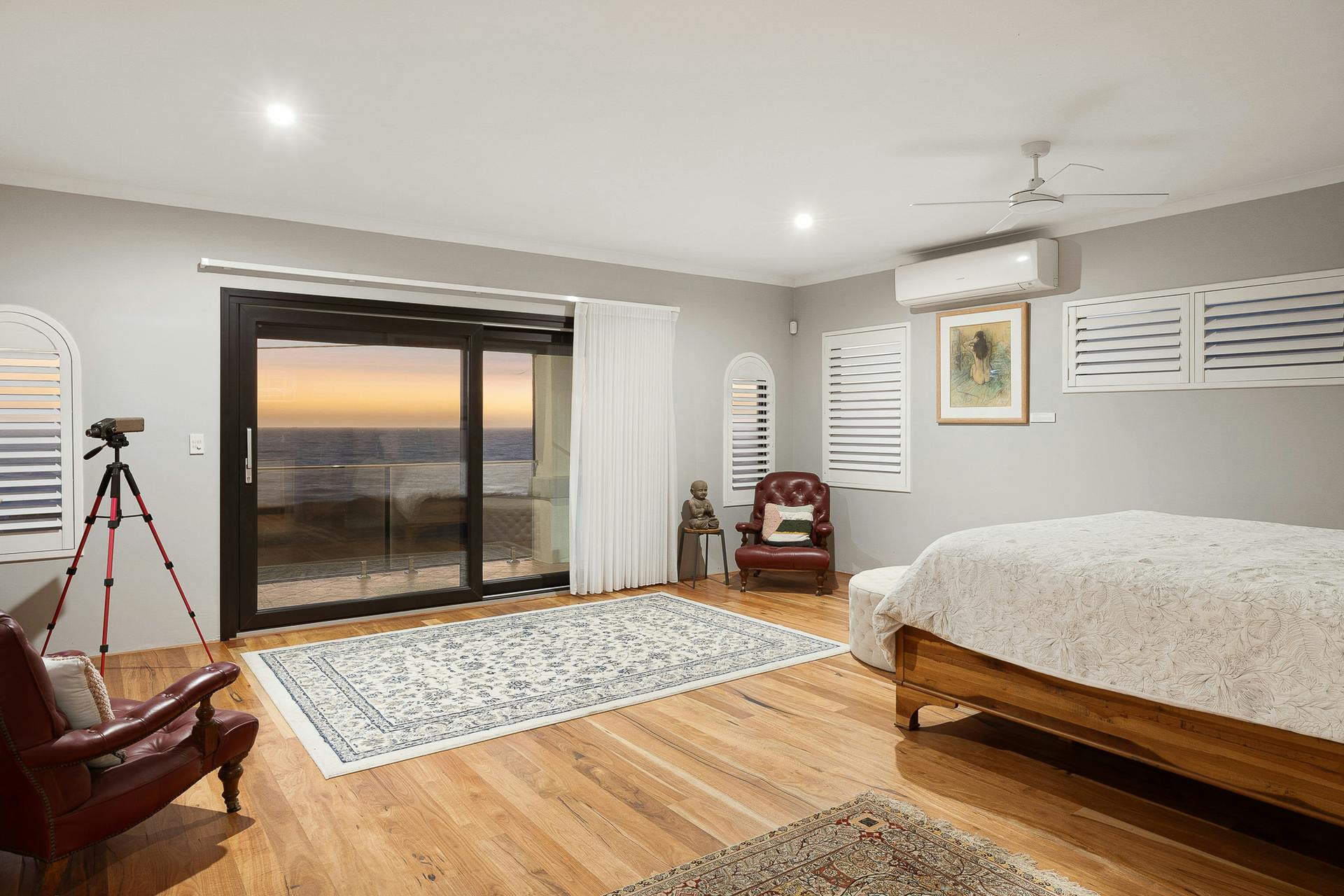 - Oversized master suite to the upper level, with plantation shutters to the windows and sweeping ocean views, including sliding doors to a private balcony, with dual walk-in robes and a separate dressing area