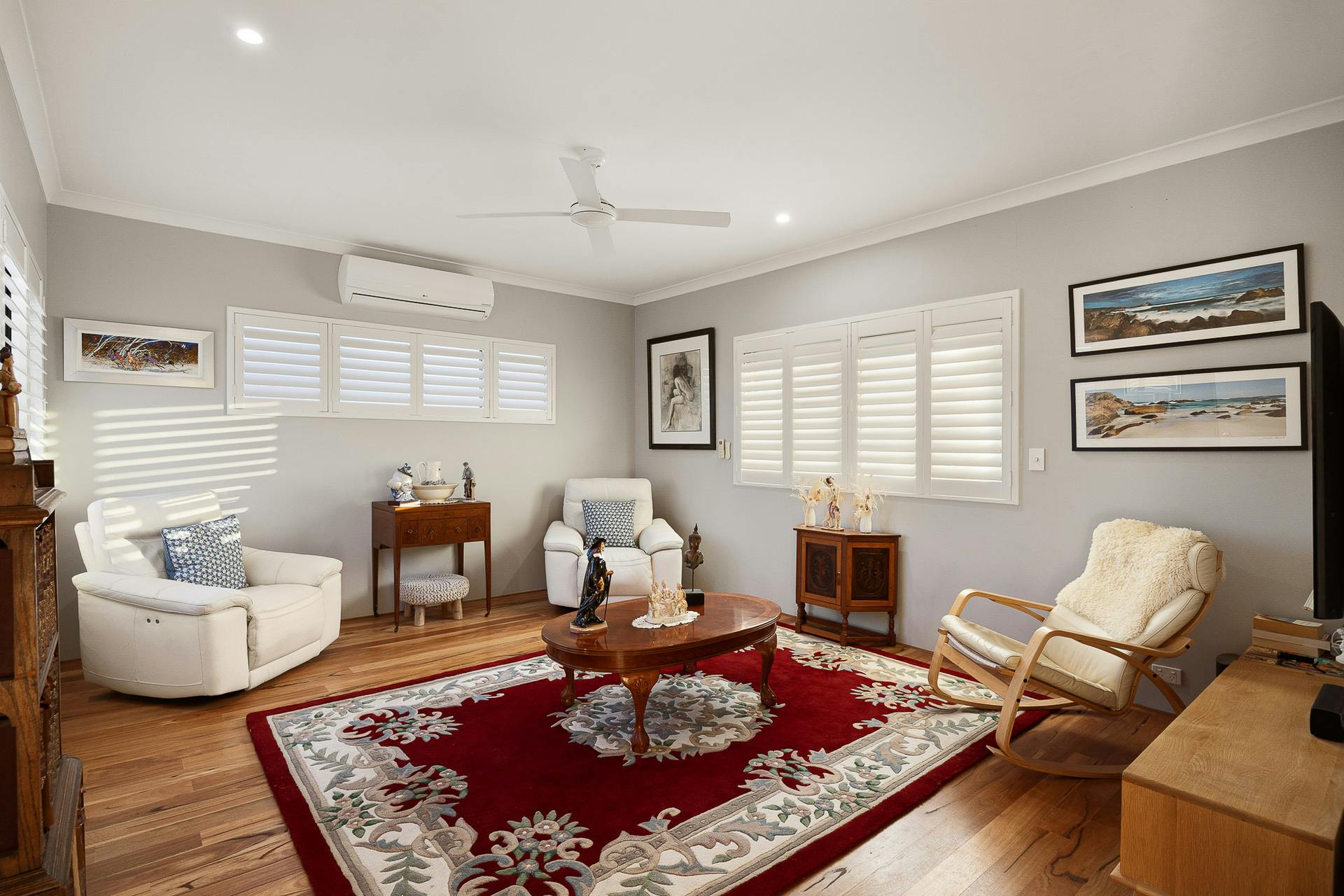 - Parents retreat or living space to the upper level, with plantation shutters to the windows, and another a reverse cycle air conditioning unit with ceiling fan for comfort