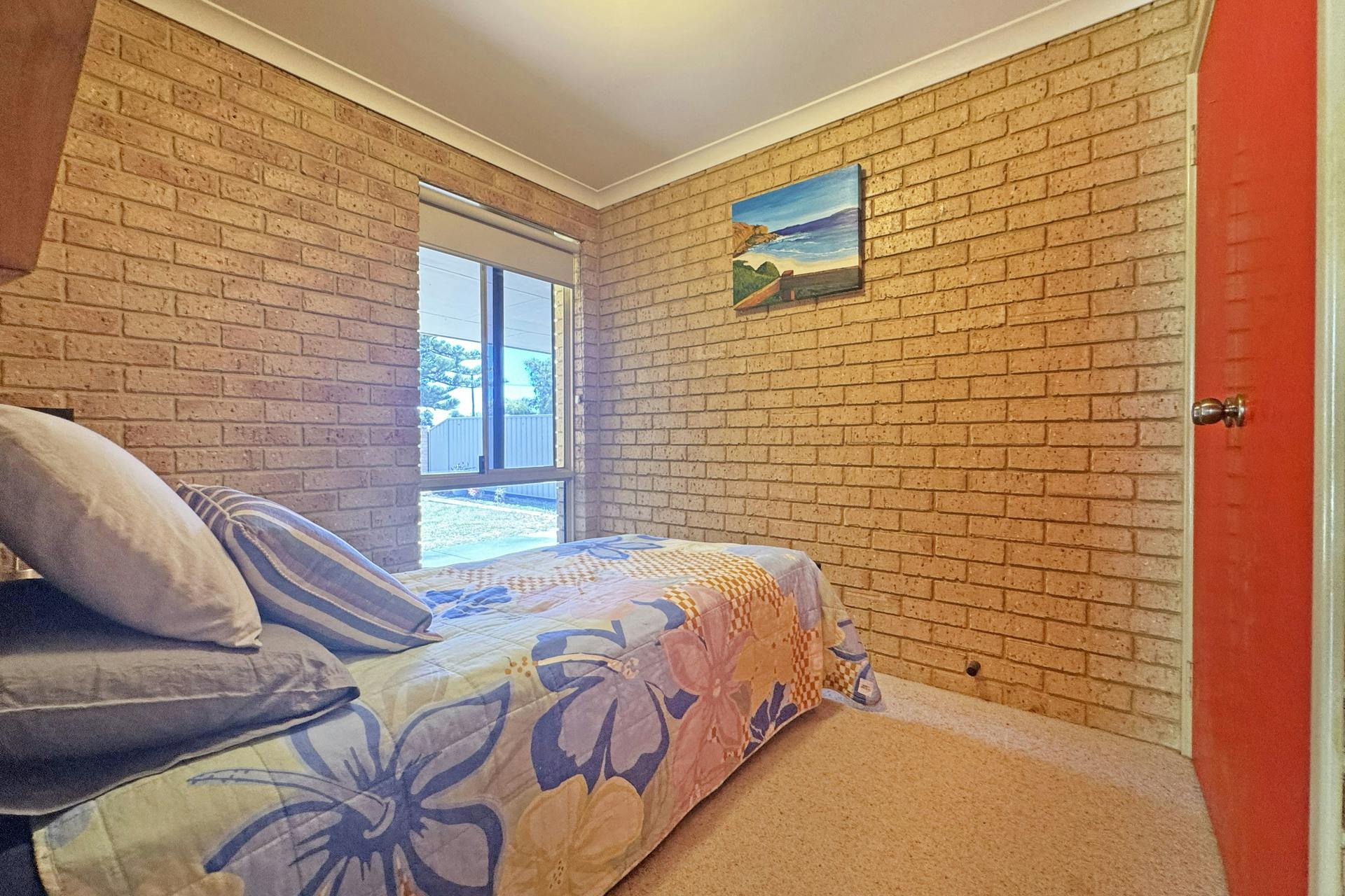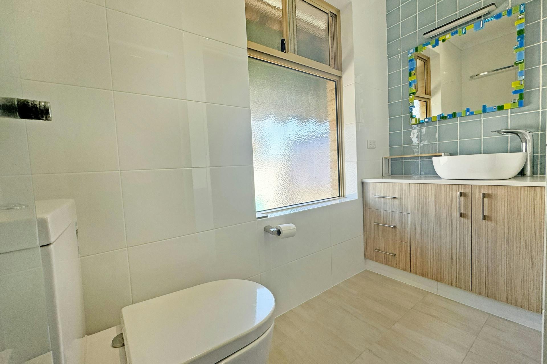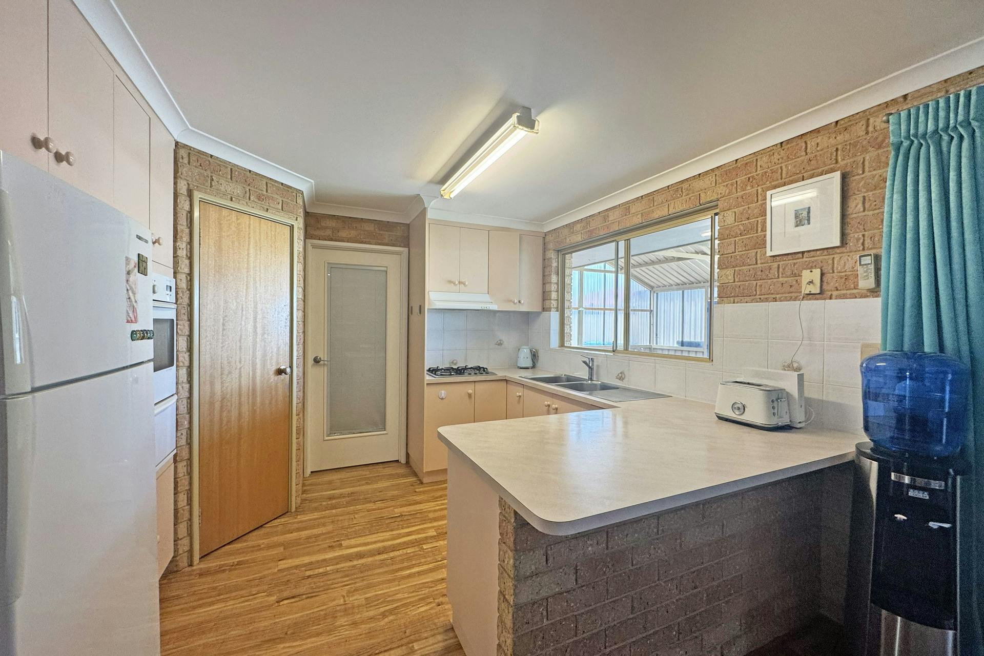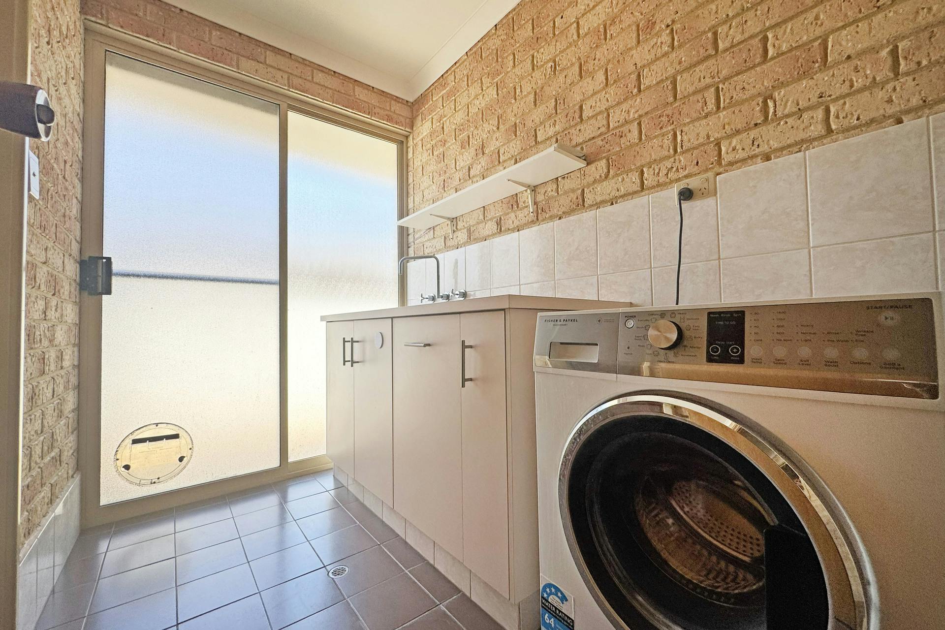- Laundry, tiled, built-in trough with cupboards and bench space, linen cupboard, separate WC, sliding door to side yard
