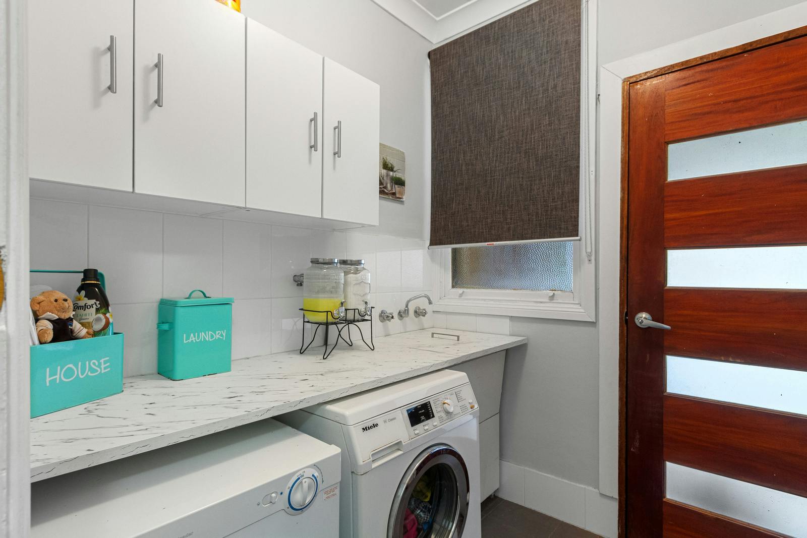 The updated bathroom includes a shower, bath, vanity, and toilet, and the renovated laundry offers modern cabinetry and a practical bench over the washer and dryer space.