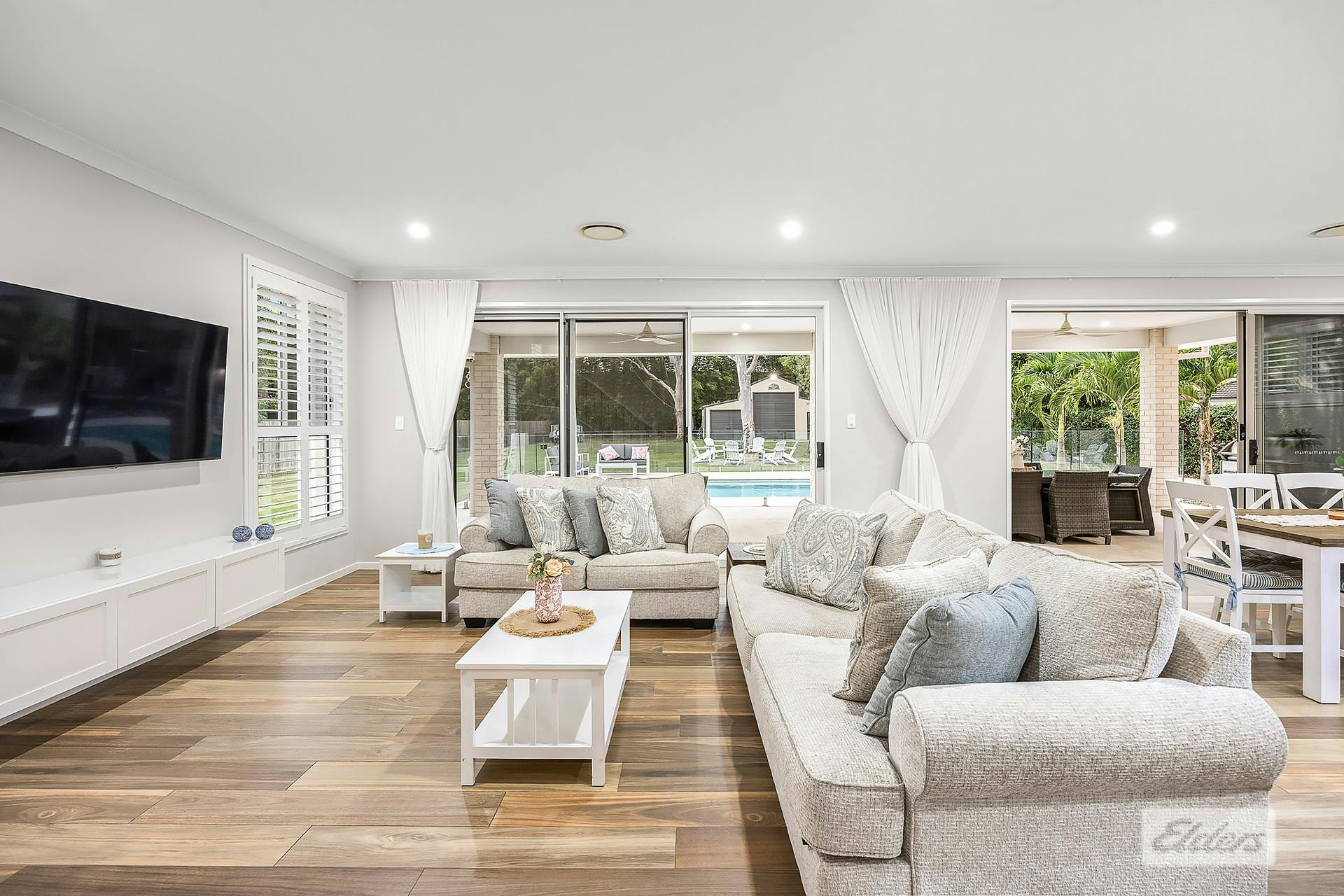 At the centre, the designer kitchen anchors the home - complete with a large walk-in pantry, dedicated butler's kitchen and seamless connection to the main living and dining zones. From here, sliding doors open to the covered outdoor entertaining area overlooking the heated in-ground pool and sprawling yard.