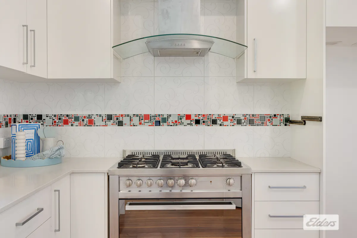 • Central kitchen featuring Caesarstone benchtops, dishwasher, corner pantry, 900mm gas stove and breakfast bar, with access to the rear verandah