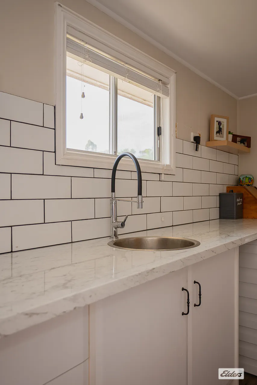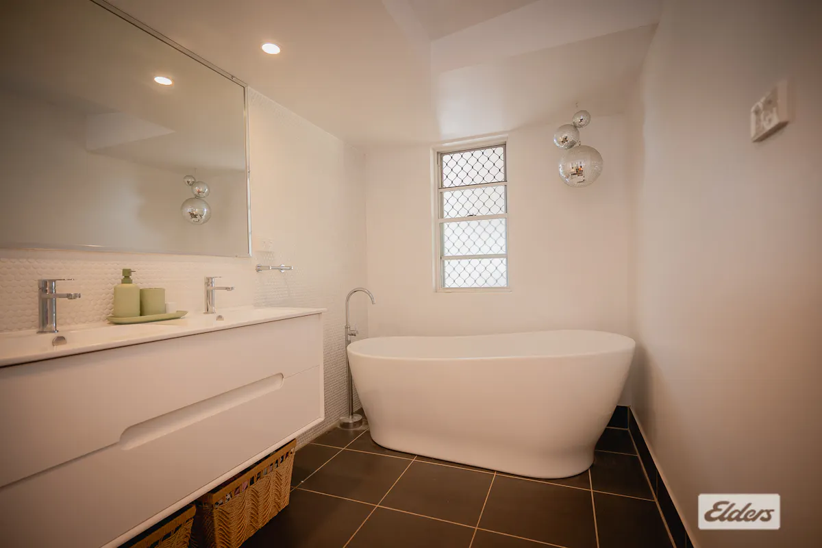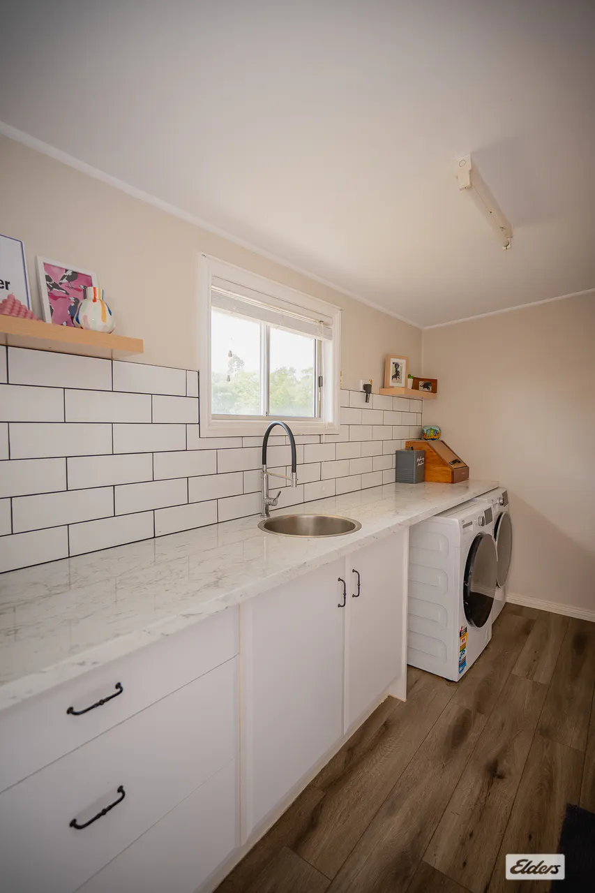 The main bathroom is conveniently located off the living area and features a deep soaking bathtub, separate shower and separate toilet. This section of the home is privately enclosed with French doors and also incorporates a mudroom space, providing practical linen storage and everyday functionality. The laundry is positioned off the kitchen with plenty of cupboard and bench space.