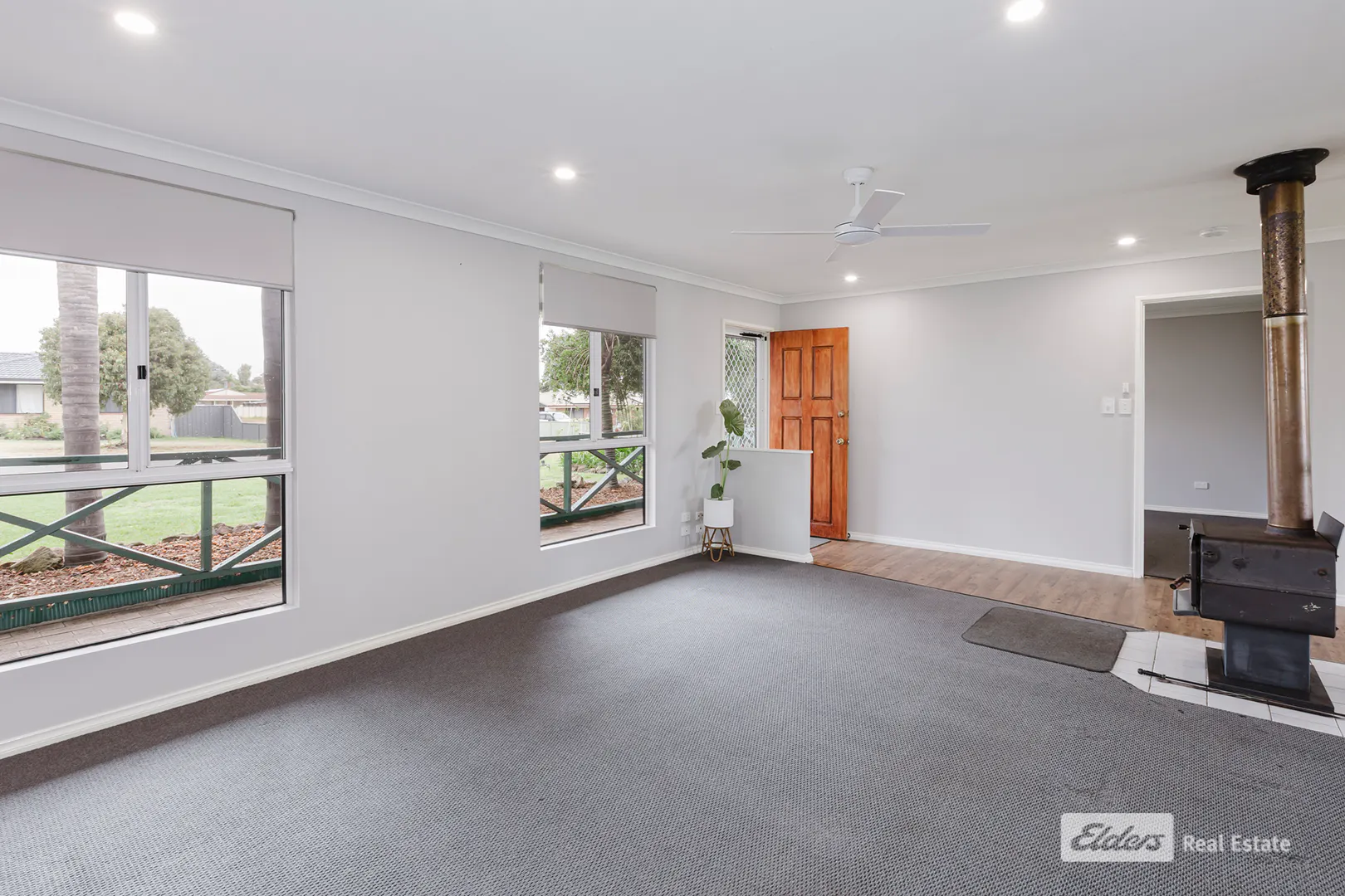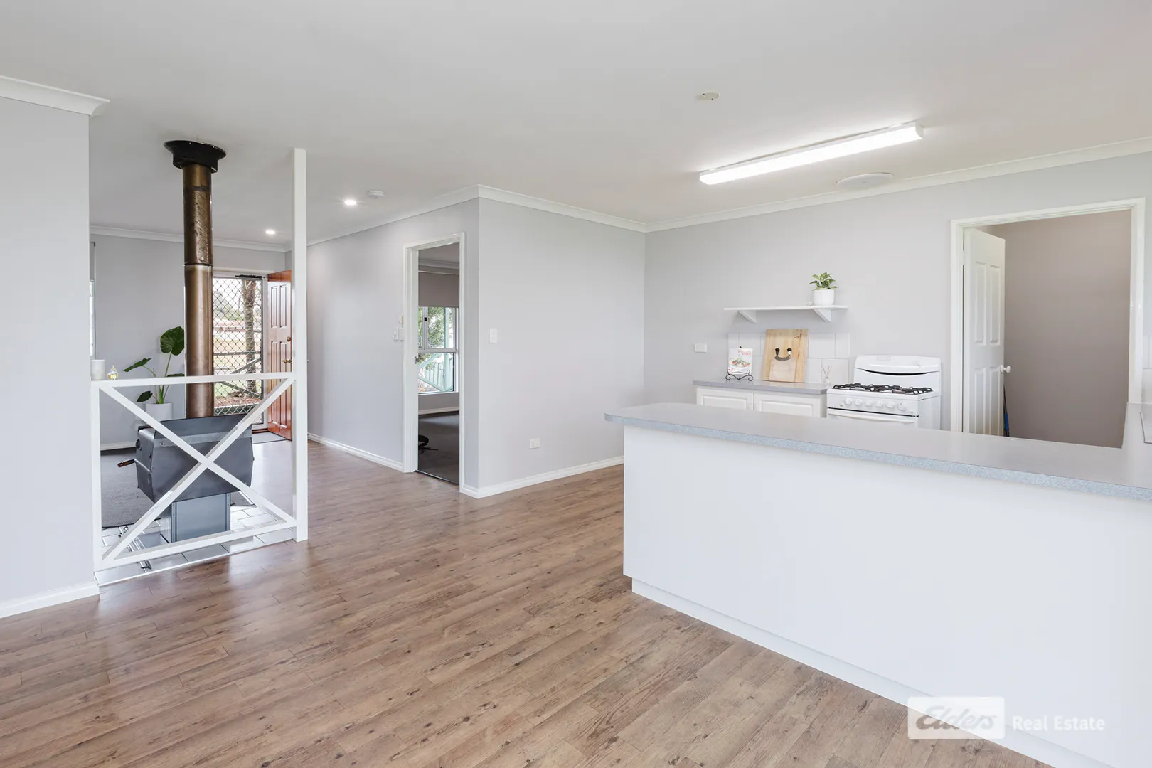 Inside, the home feels bright, fresh and functional, with a practical floorplan designed for easy living. A centrally positioned wood fire helps warm the home in winter, while insulation assists with comfort through the warmer months.