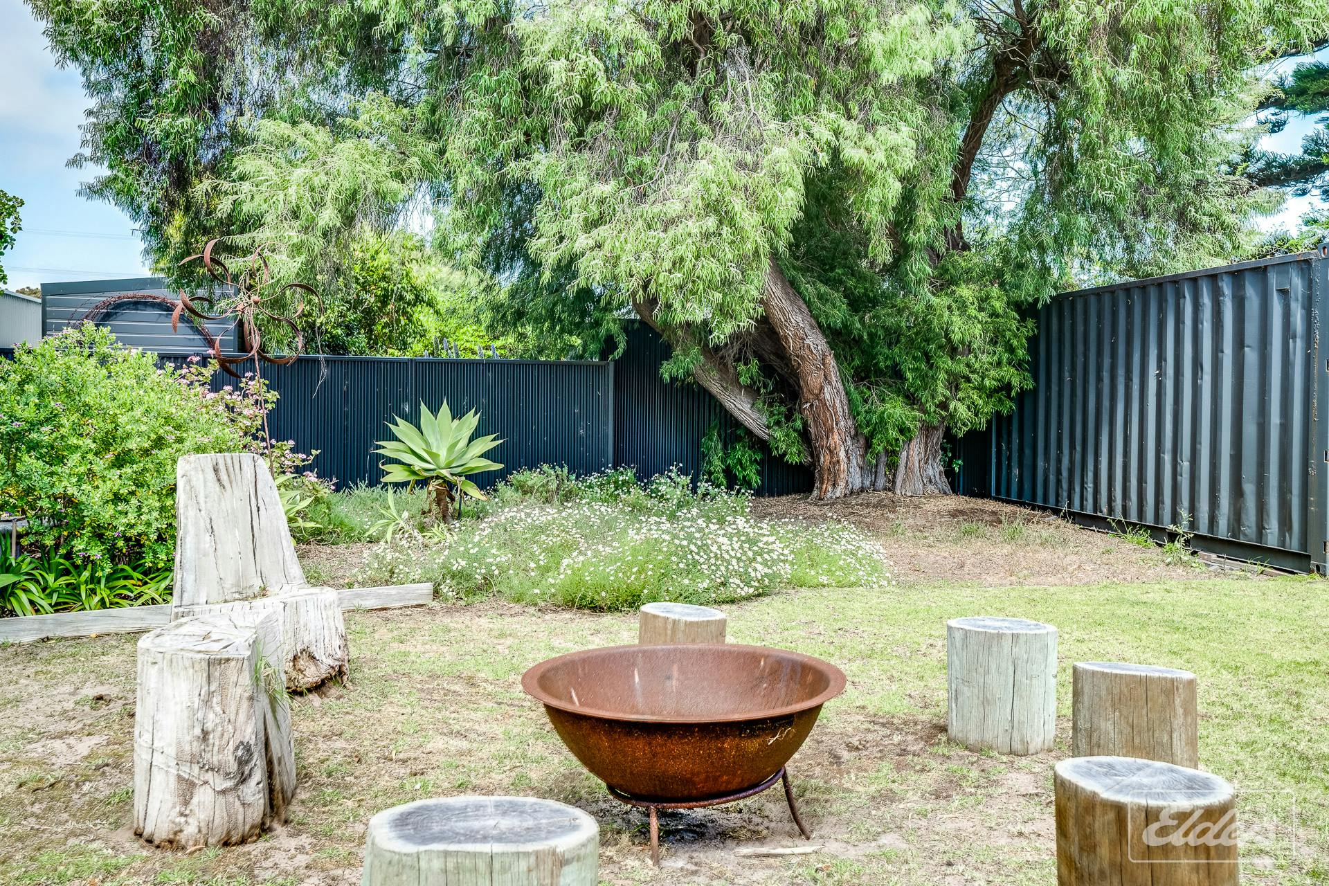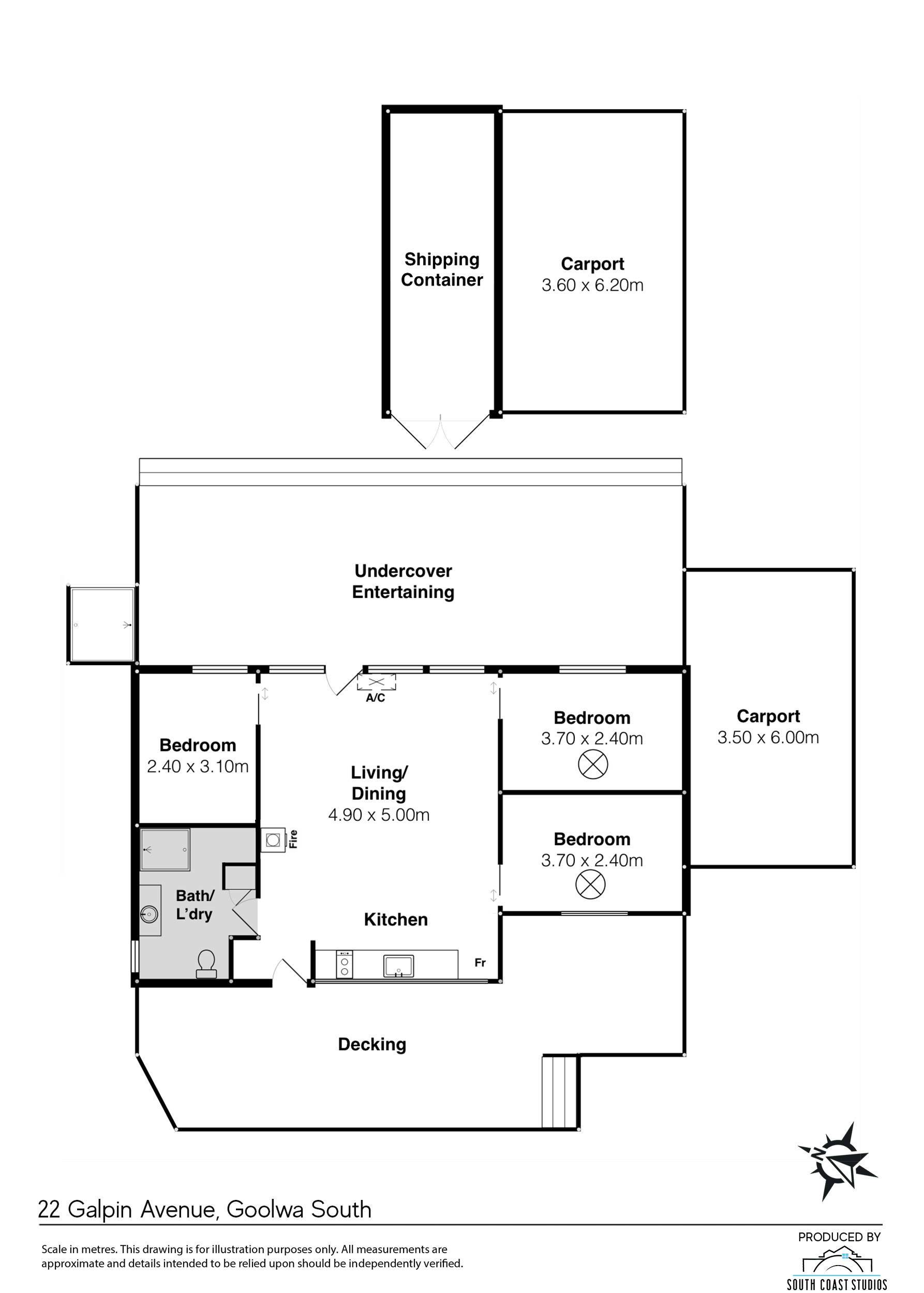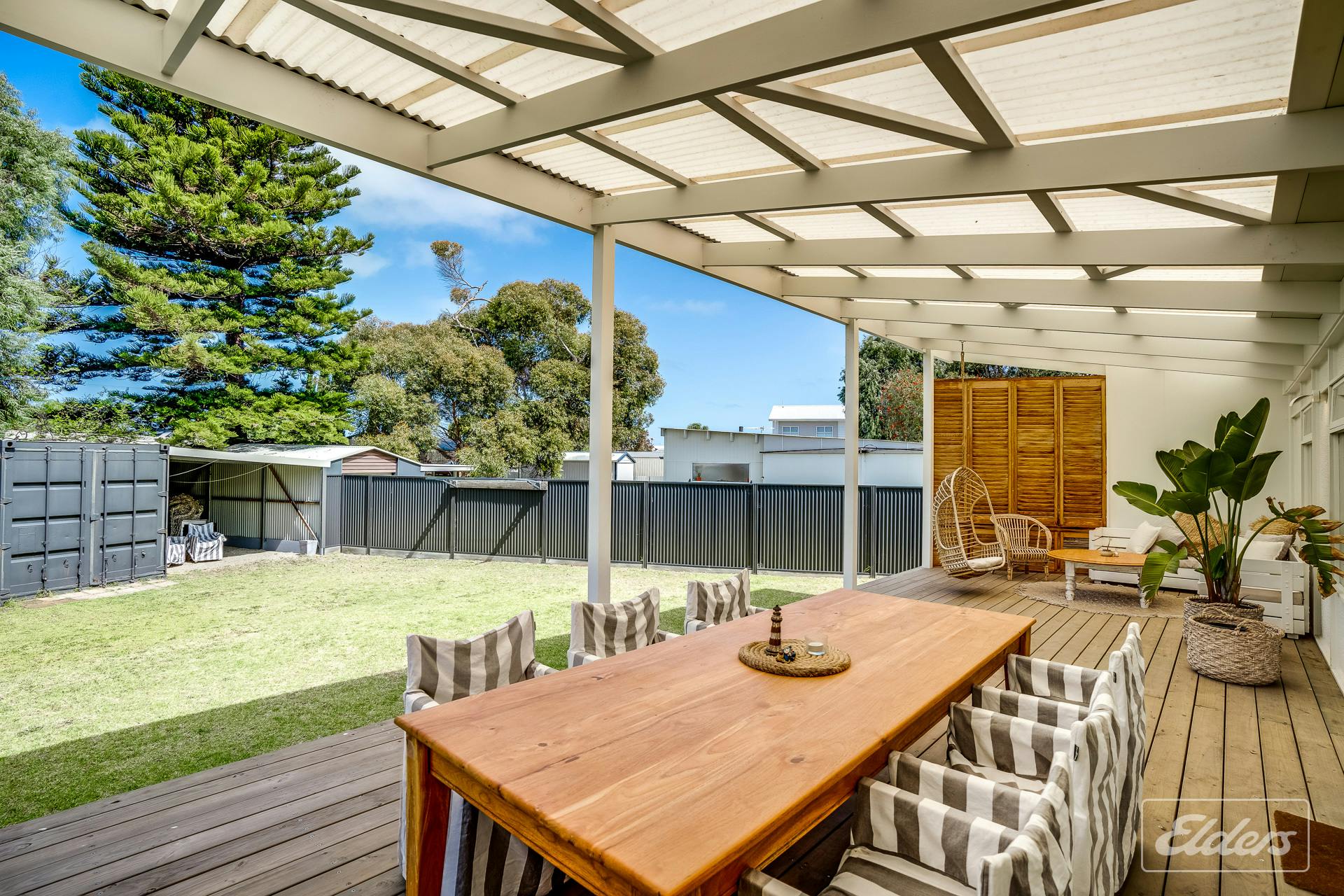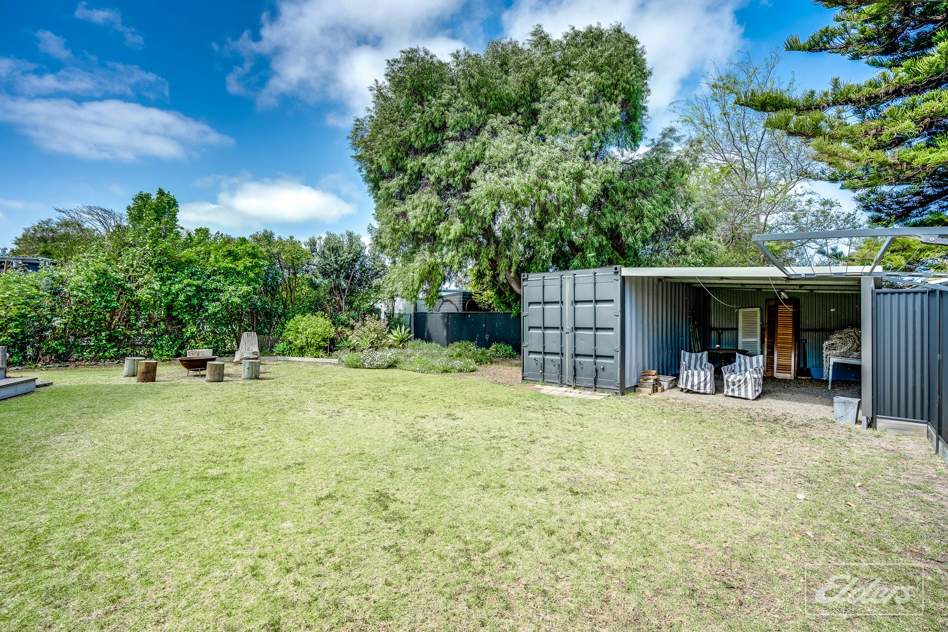A shipping container provides secure storage for holiday gear, while the attached single carport also offers a versatile covered space that can be used for games or additional entertaining. A fire pit adds to the appeal in cooler months and the outdoor hot and cold shower is perfect after a day spent at the beach or on the river.