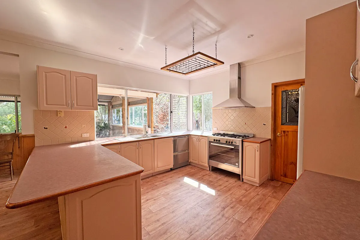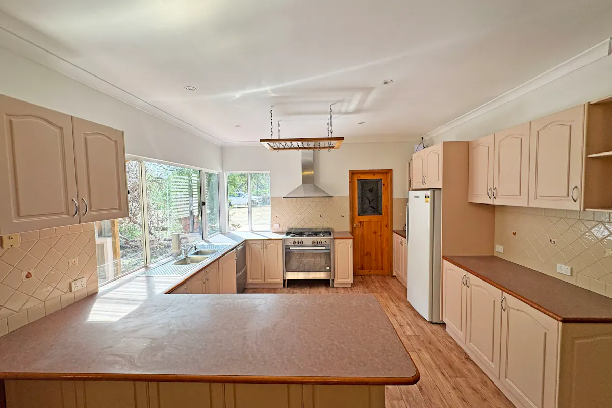 The main living area is spacious and full of country charm, featuring a cosy tile fire, split-system air conditioning and a generous kitchen complete with a wide stainless-steel gas oven, dual dishwasher and walk-in pantry.
