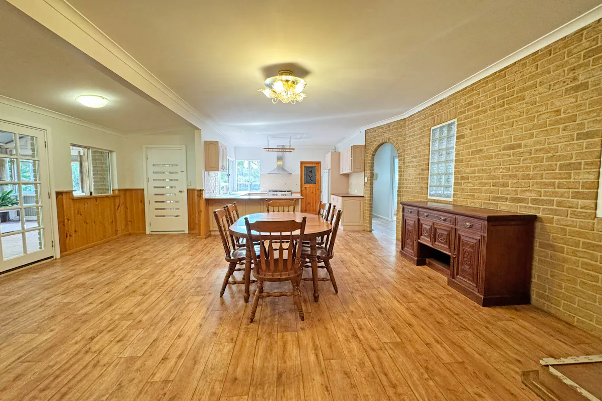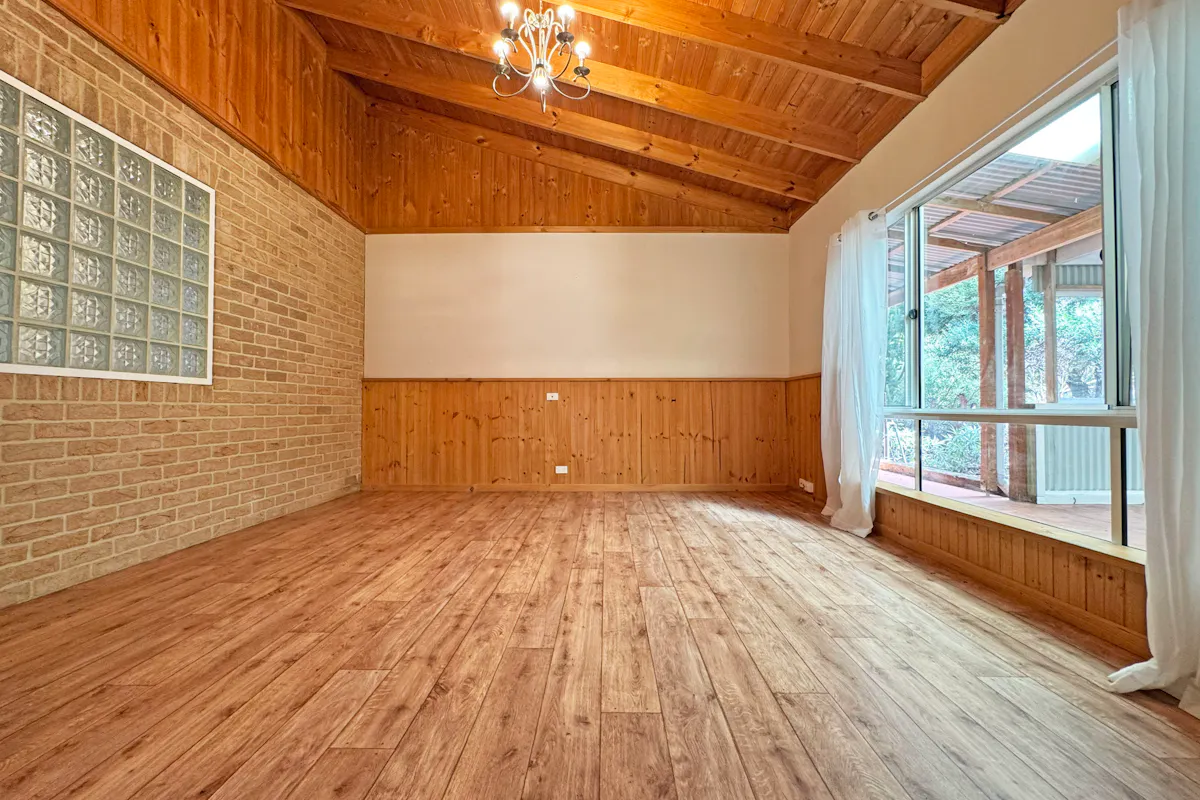 - Open living area, brick feature wall, wood look lino floor, air conditioning, half wall panelling, tile fire, double French doors to lounge room, double French doors to patio