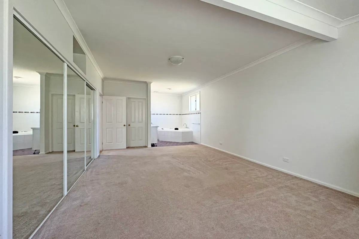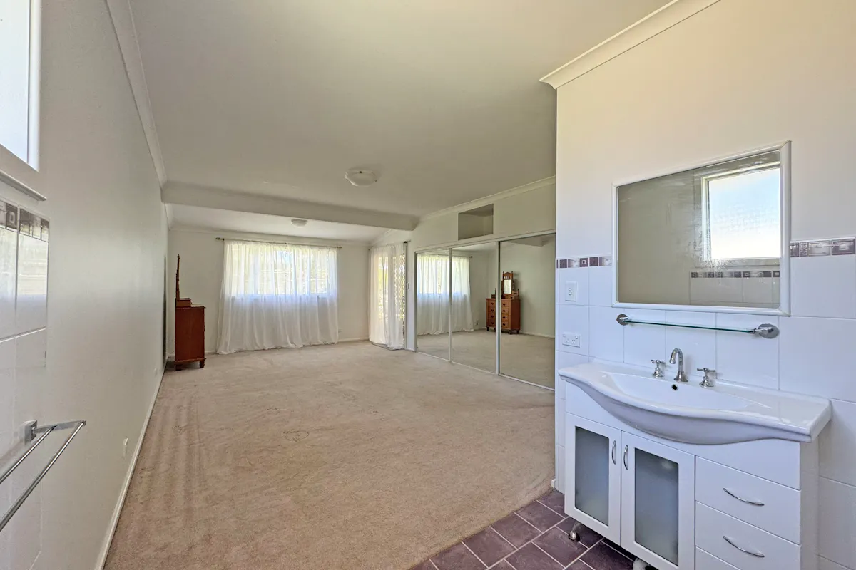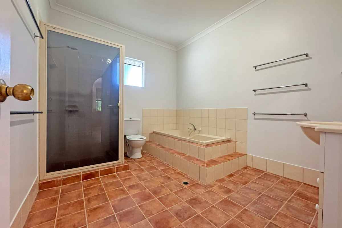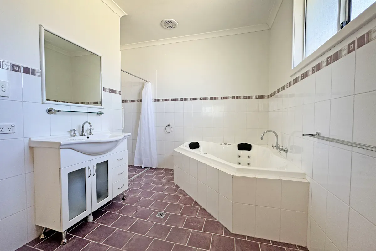 - Primary bedroom, triple sliding robe, carpeted, direct access to verandah, open ensuite with shower, corner bath, vanity and separate toilet.