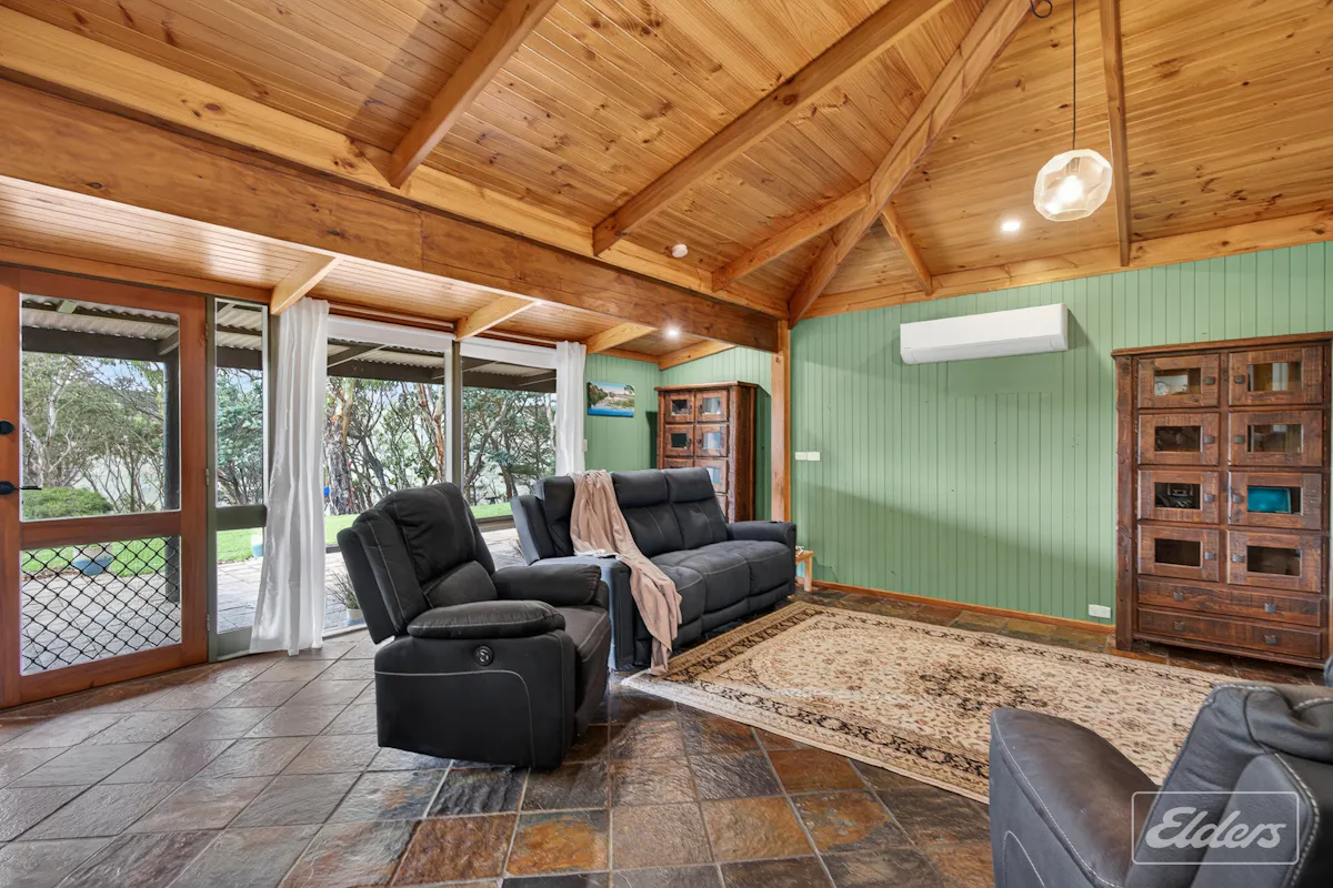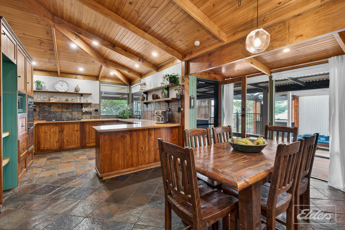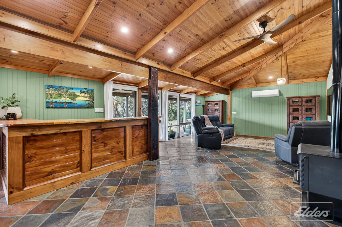 Inside, the home features warm timber ceilings, slate flooring and a functional layout centred around open-plan living. The main living and dining area is generous in size and connects directly to both the kitchen and outdoor spaces. Comfort is well covered with a combustion heater, split system air conditioning and insulated panel construction.