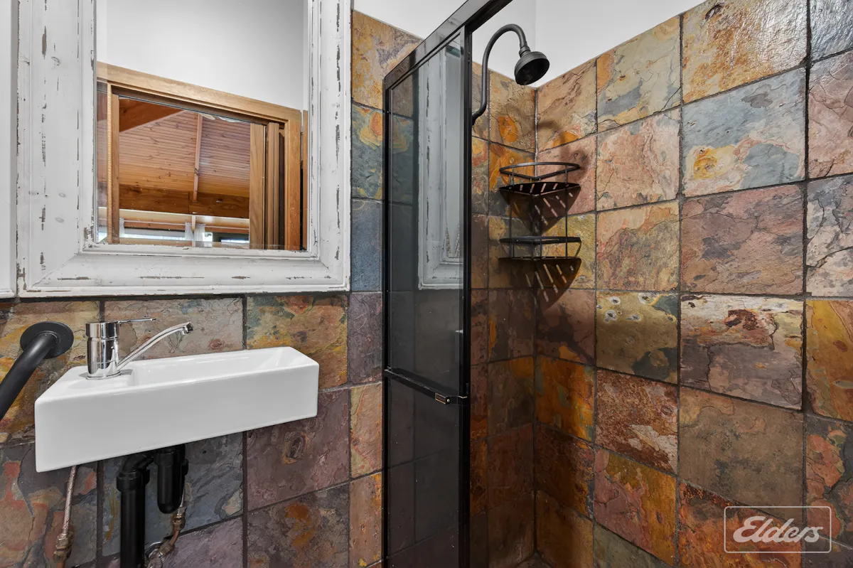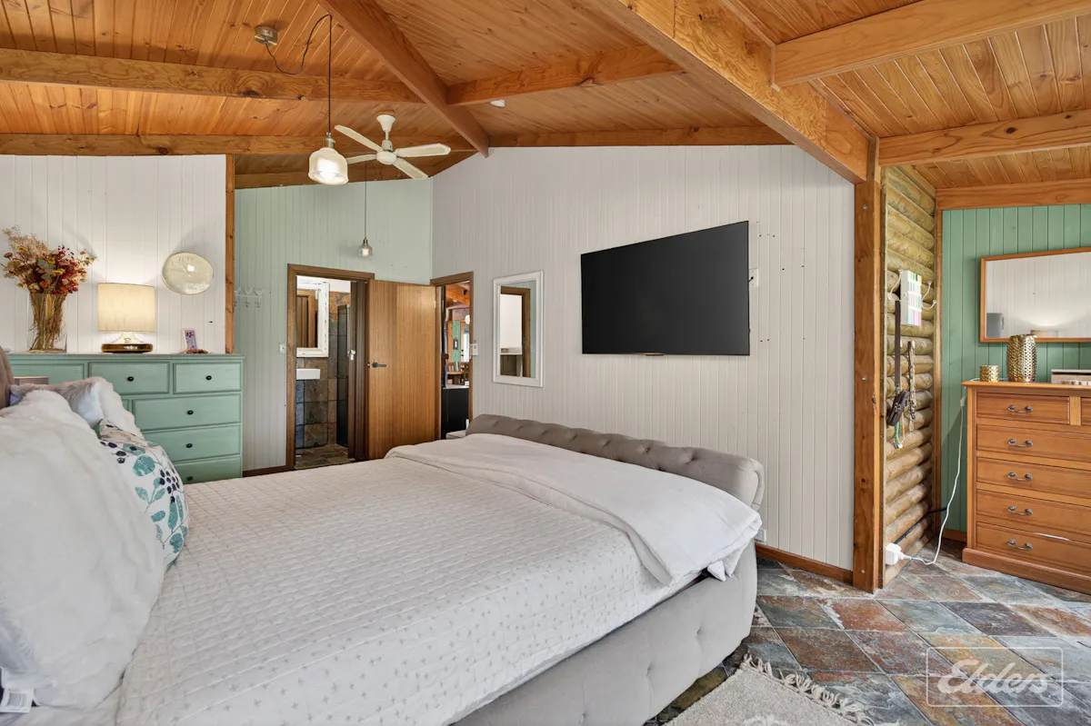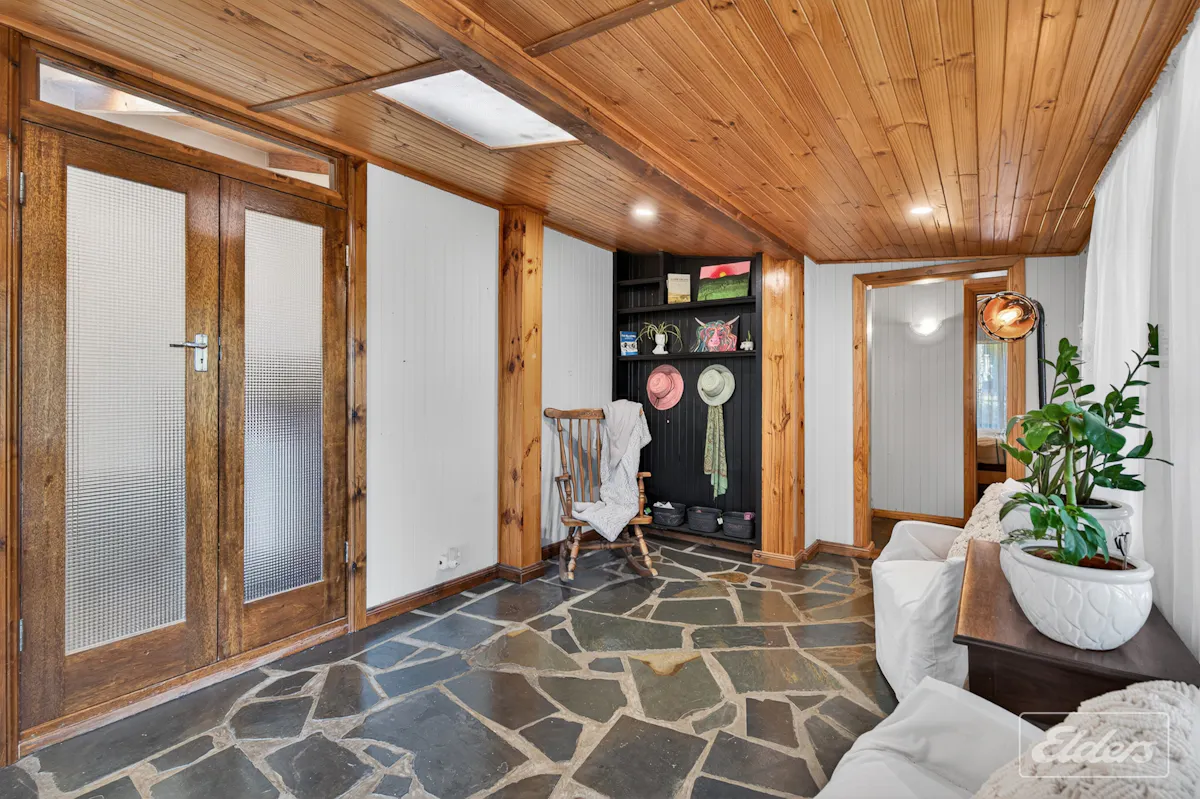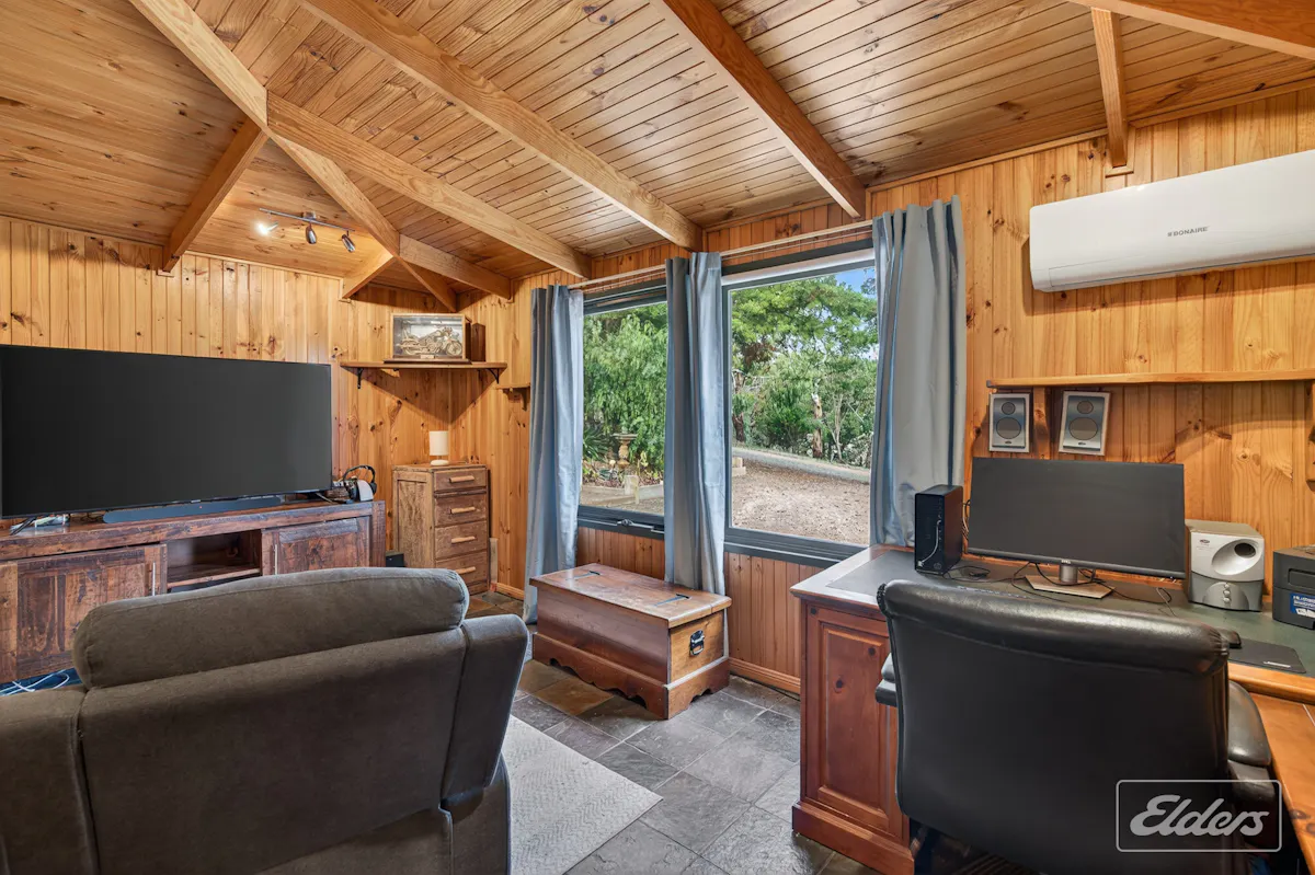Inside, the home features warm timber ceilings, slate flooring and a functional layout centred around open-plan living. The main living and dining area is generous in size and connects directly to both the kitchen and outdoor spaces. Comfort is well covered with a combustion heater, split system air conditioning and insulated panel construction.