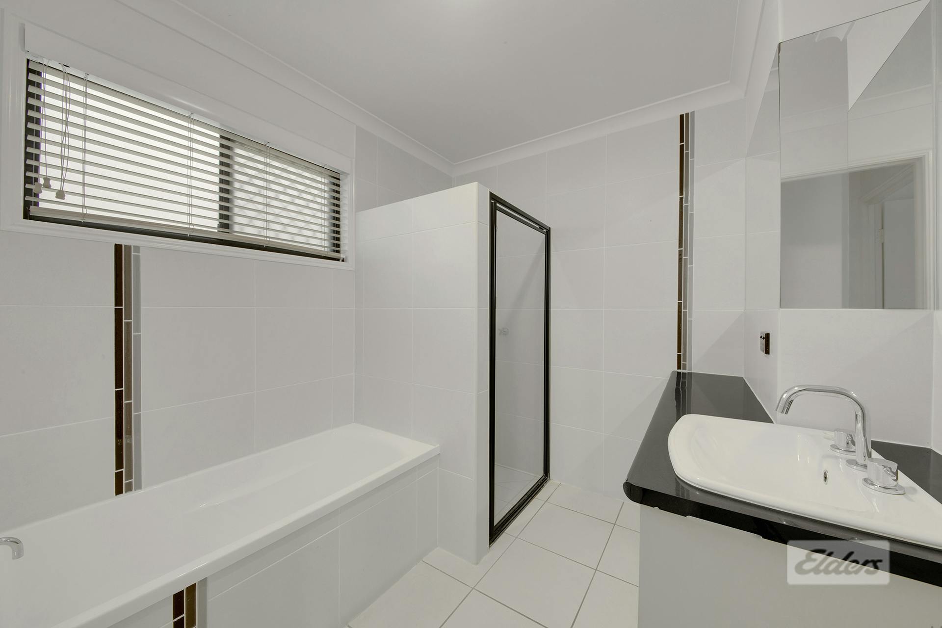 The centrally located bathroom features floor-to-ceiling tiles, a separate bath and shower, and a spacious vanity with plenty of bench space. A separate toilet adds extra convenience for busy households.