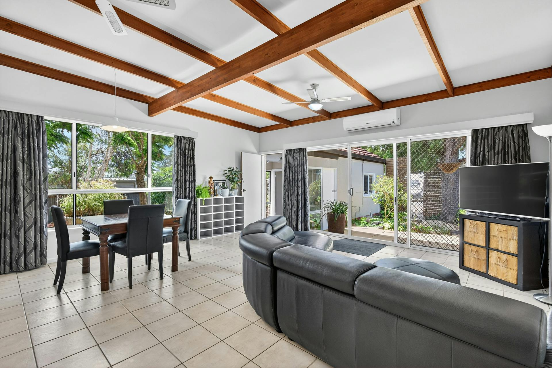 The formal lounge, with its slow-combustion heater, offers a cosy winter retreat and flows through to the extended living area-or formal dining room if preferred-also fitted with reverse-cycle air conditioning. Centrally positioned, the modern kitchen provides excellent storage with ample drawers, glass splashbacks and a generous walk-in pantry, and opens to the light-filled casual living/dining extension. This inviting space features another split-system air conditioner and enjoys lovely views over the established gardens and outdoor entertaining areas. Two additional carpeted bedrooms with ceiling fans sit within this wing of the home.