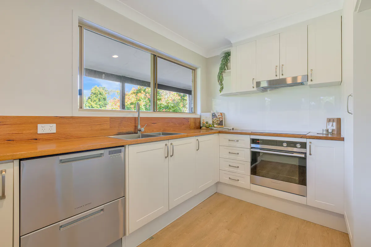• Country style kitchen boasts solid Tasmanian Oak benchtops, Fisher and Paykel appliances include double dish drawers, corner pantry, soft-close drawers, and breakfast bar