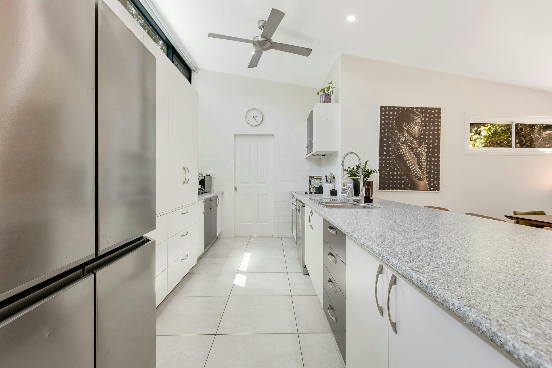 • The galley-style kitchen is well equipped with plenty of storage and large breakfast bar