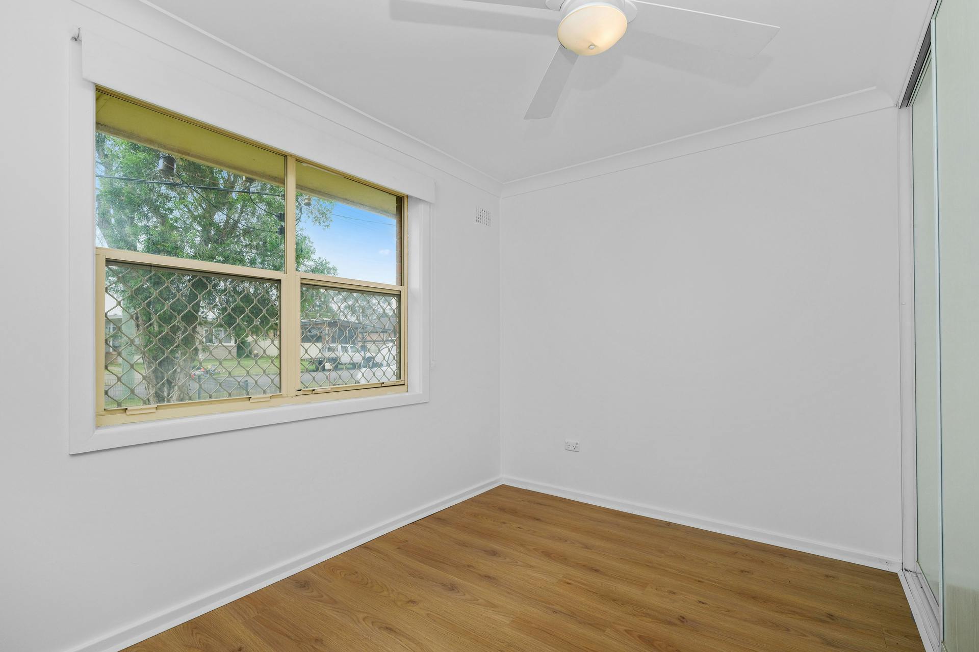 Main bedroom with built-in wardrobe and ceiling fan