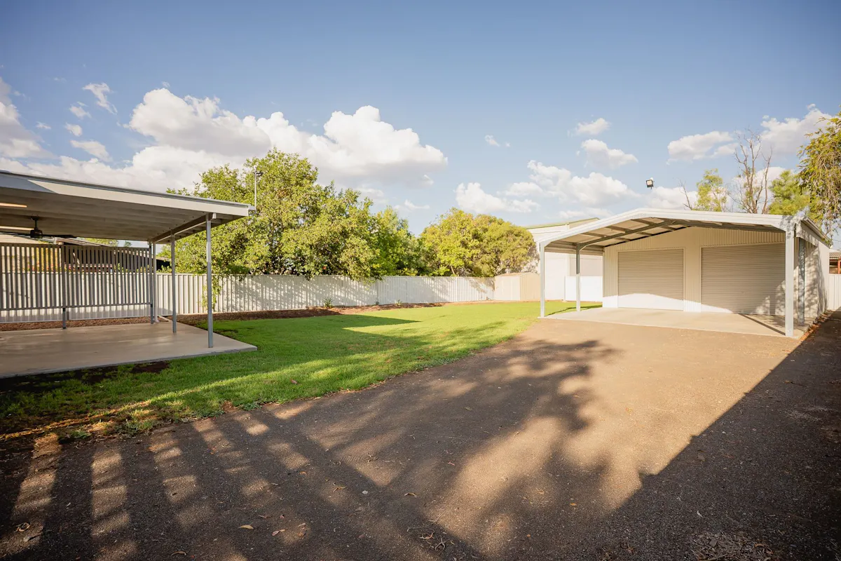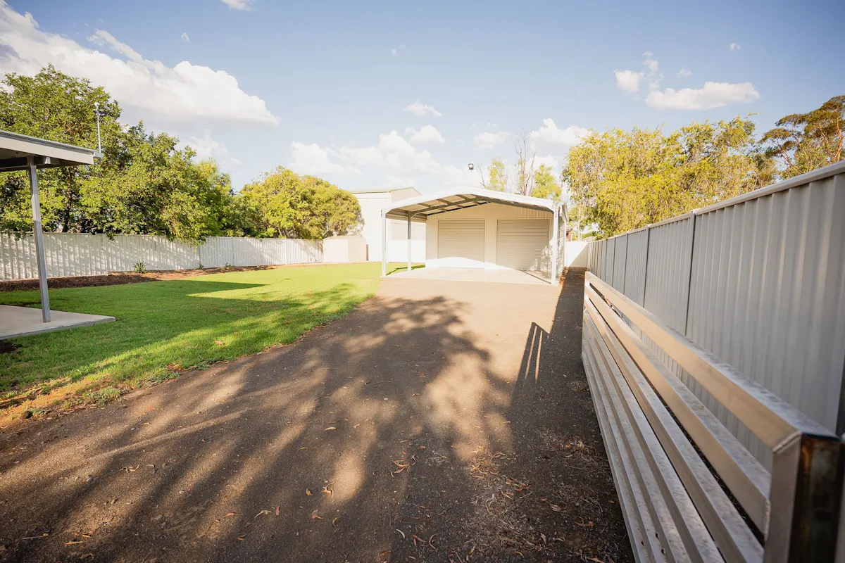 - Large powered two-bay shed with concrete floor, electric roller doors, carport to the front, and additional shed space to the rear