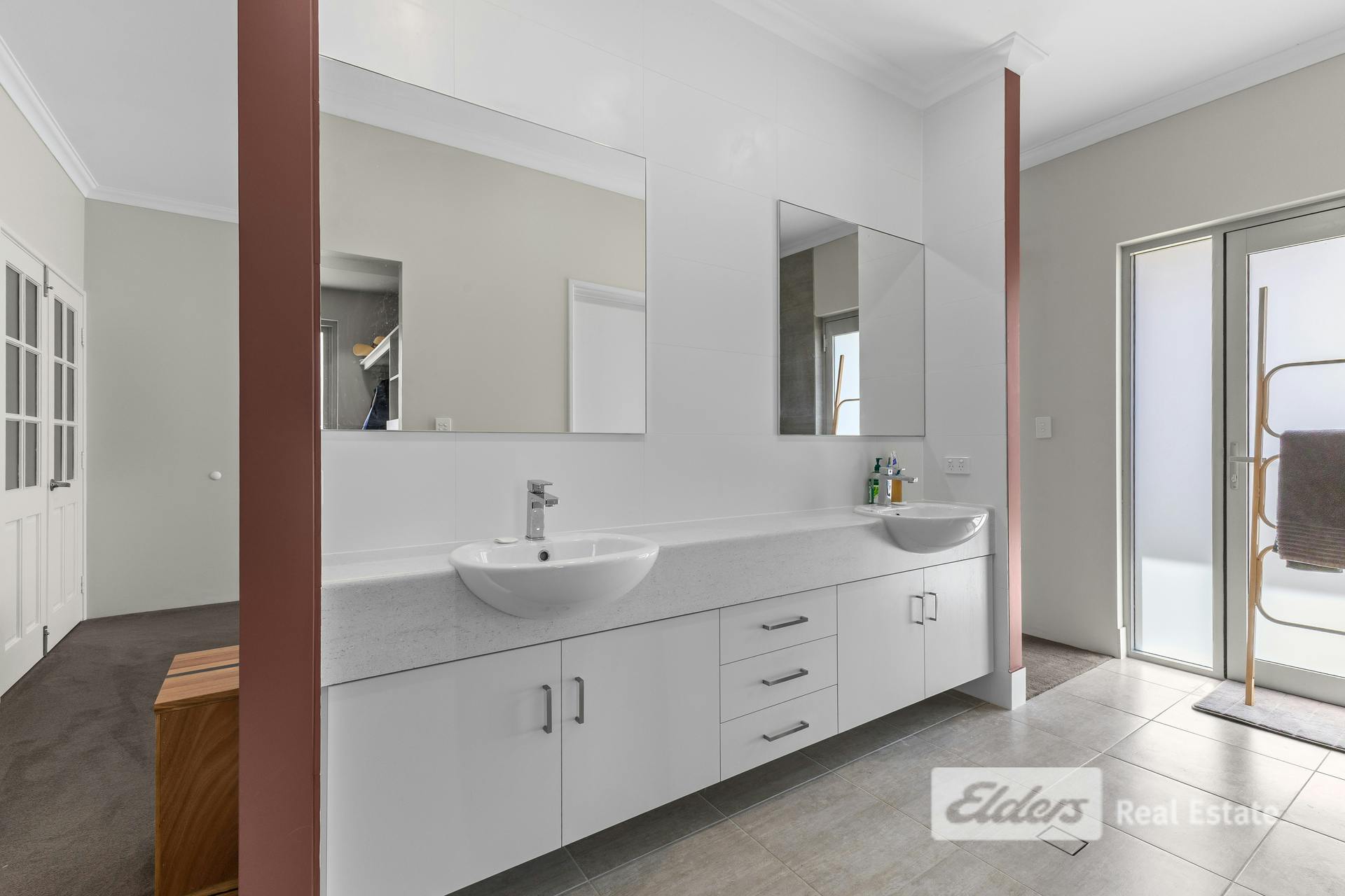 The master retreat, privately positioned at the rear of the home, features a walk-in robe, double basins, generous shower, separate WC, and a door opening directly to the garden and potential pool area.