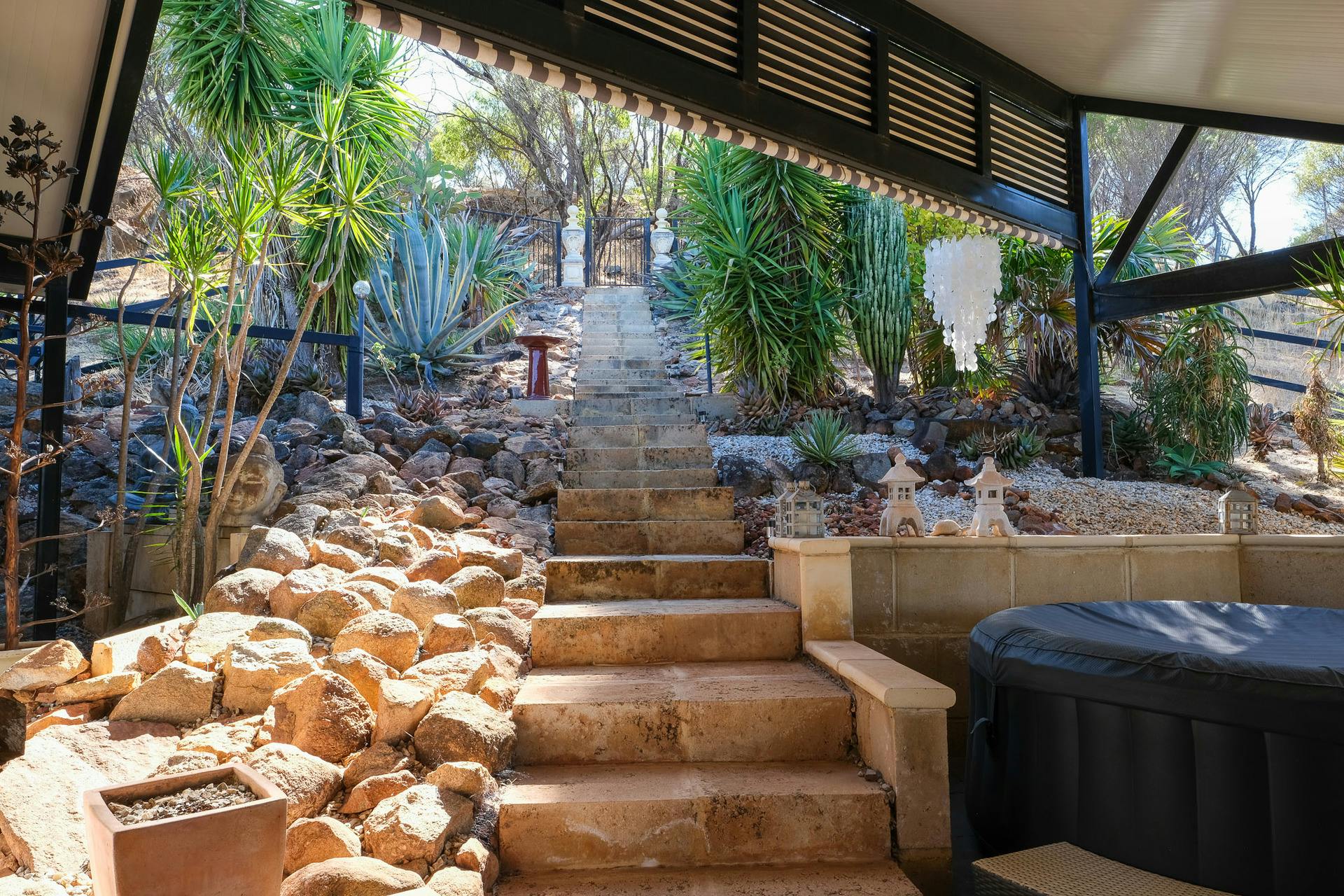 The low-maintenance grounds feature striking succulents and flowering plants year-round, along with established vegetable beds currently producing radishes, rhubarb, celery, basil, onions and parsley.