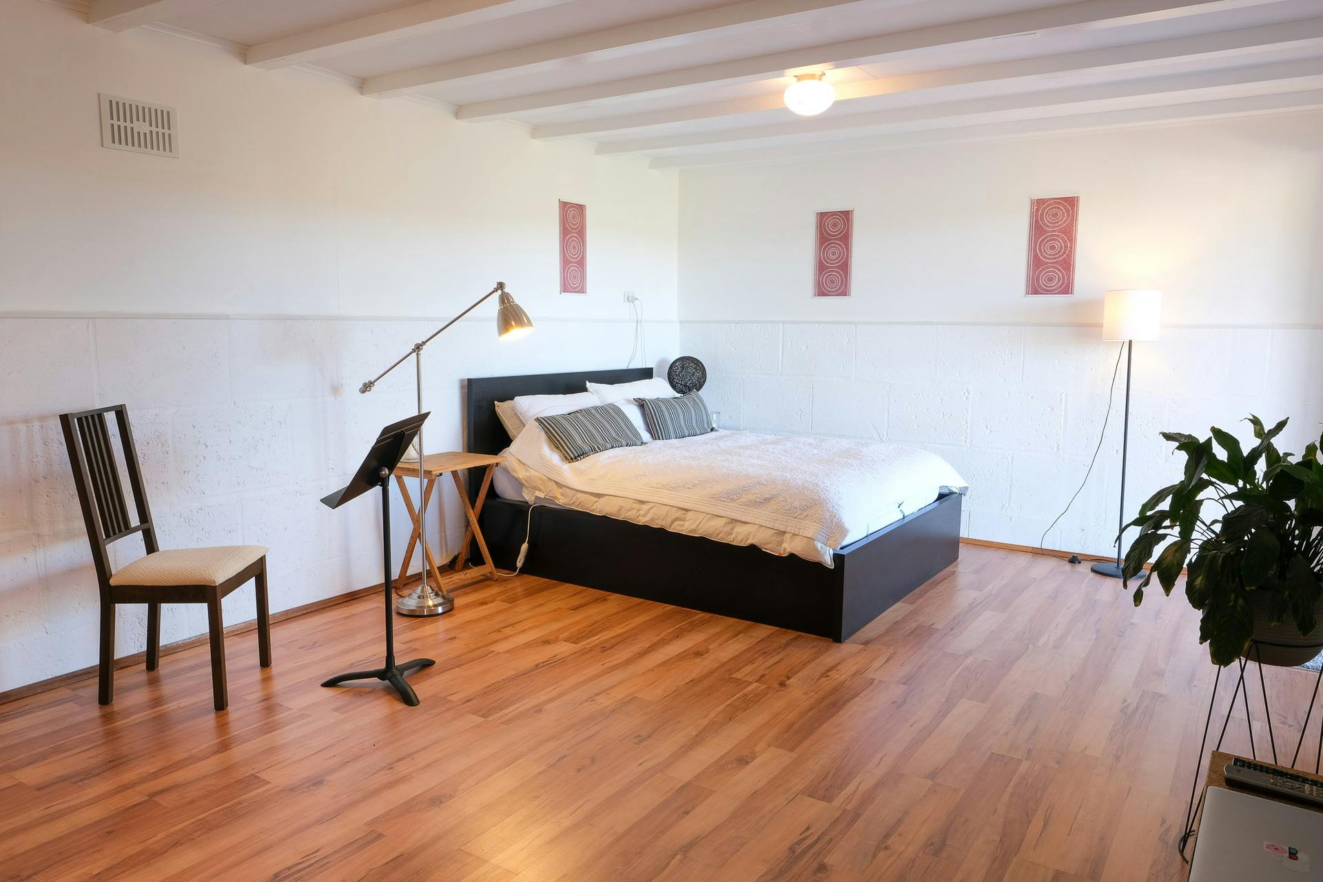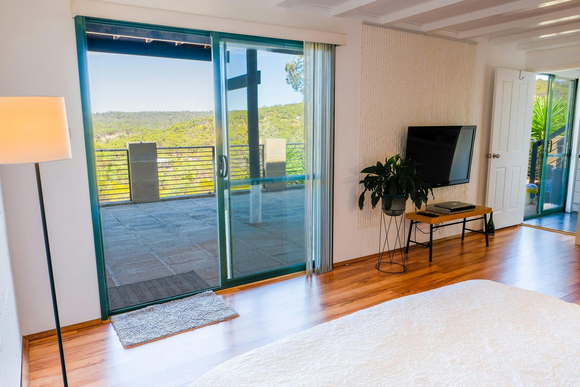 Three bedrooms enjoy valley views - one currently configured as a large studio, the other as a main bedroom that steps out onto the veranda outside and the ancillary bedroom downstairs which also opens out to the veranda.