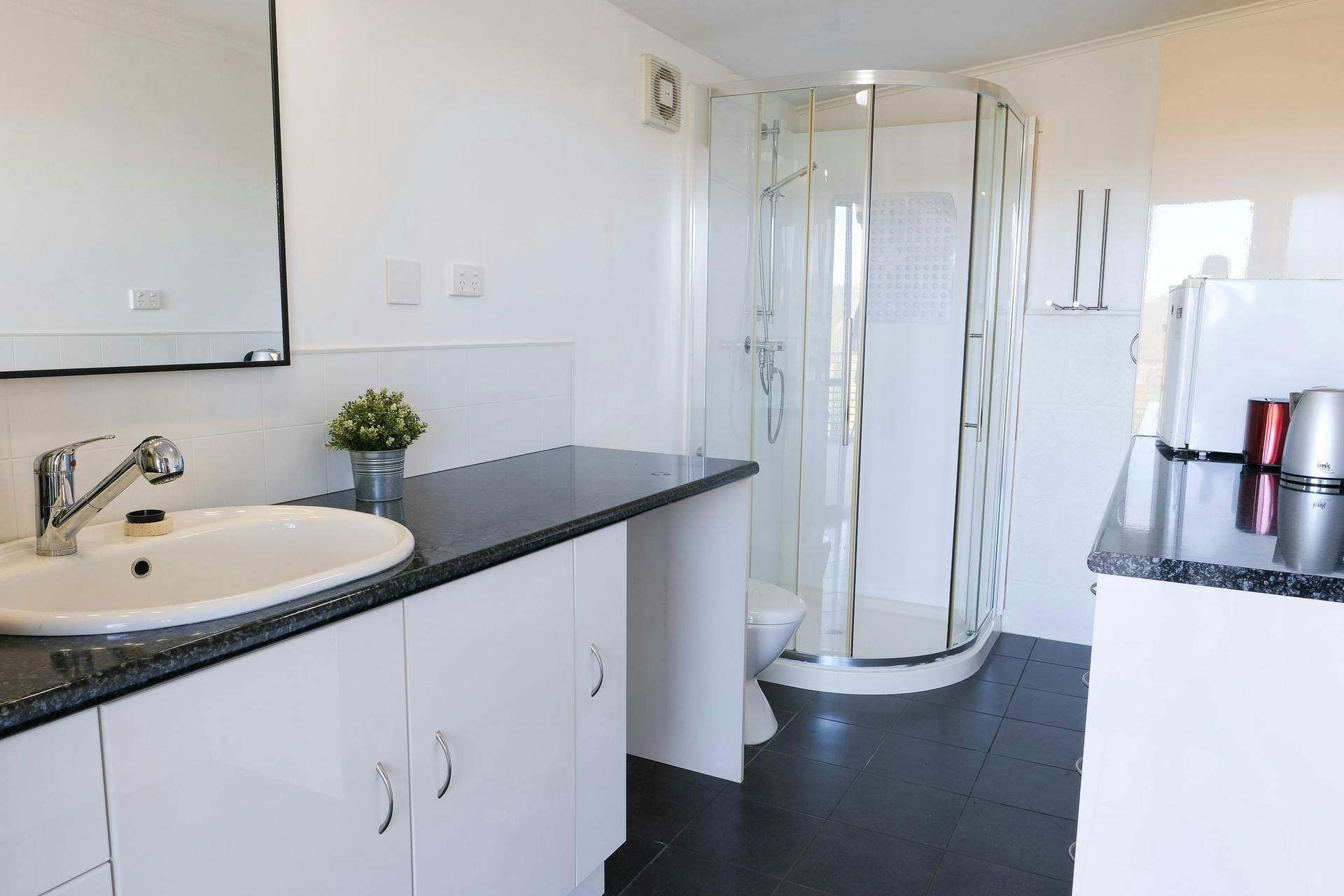 A compact, newly built laundry is cleverly integrated into the master suite with stacked washer/dryer and access to a built-in washing line on the lower terrace.