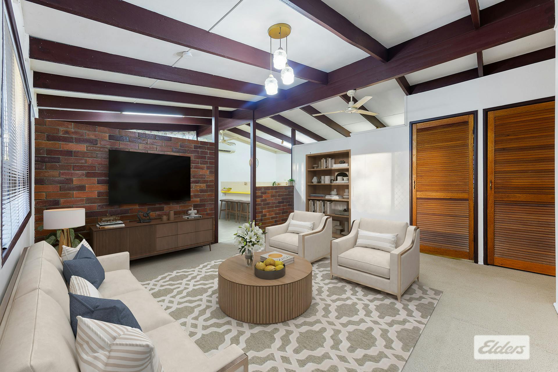 •Living area with raked ceilings
