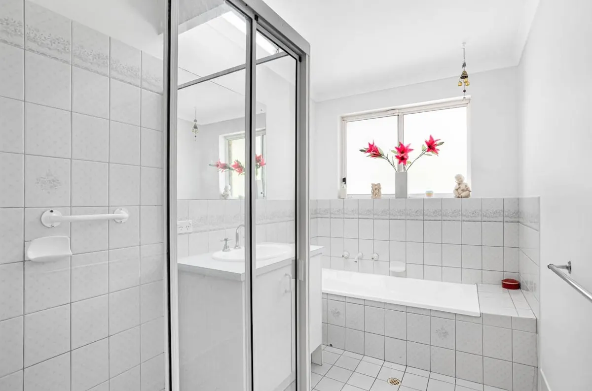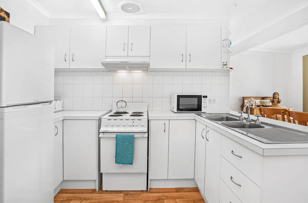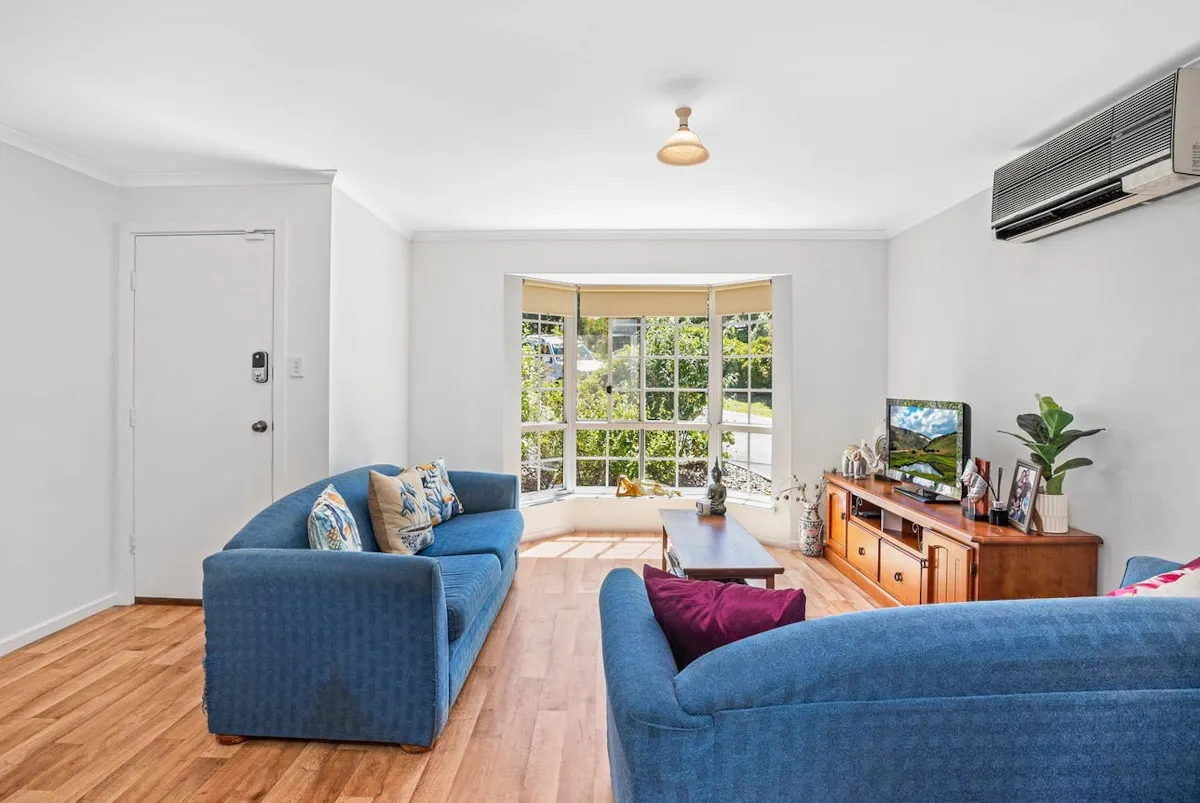 The compact all-electric kitchen is perfectly positioned for easy conversation and connection, overlooking both the dining area and nature beyond. Centrally located, the main bathroom includes a shower, bath, and vanity, complemented by a separate WC and laundry for added practicality. Both bedrooms are well-proportioned, with the master featuring built-in robes, while the second bedroom offers flexibility as a guest room, home office, or creative space.
