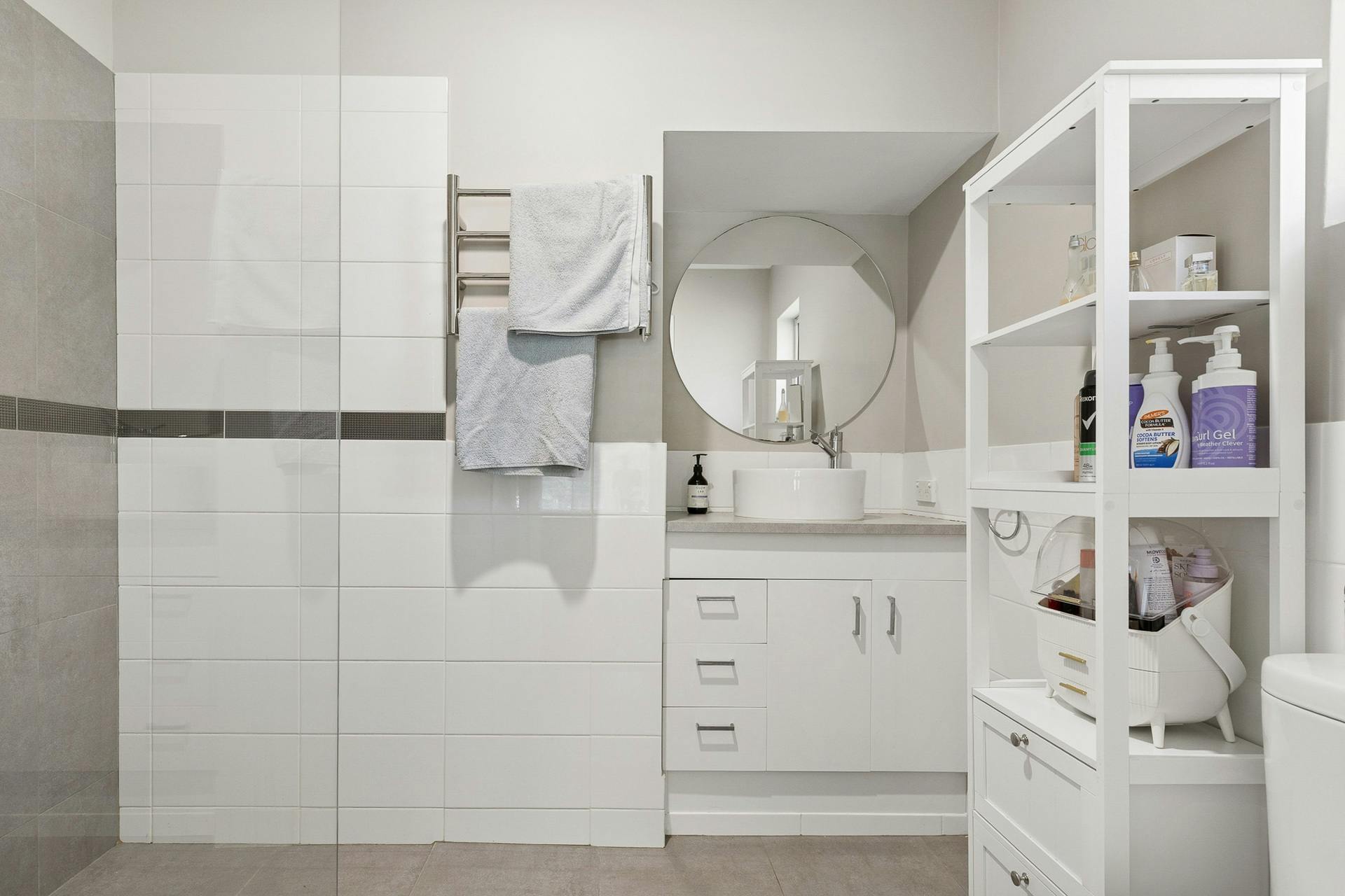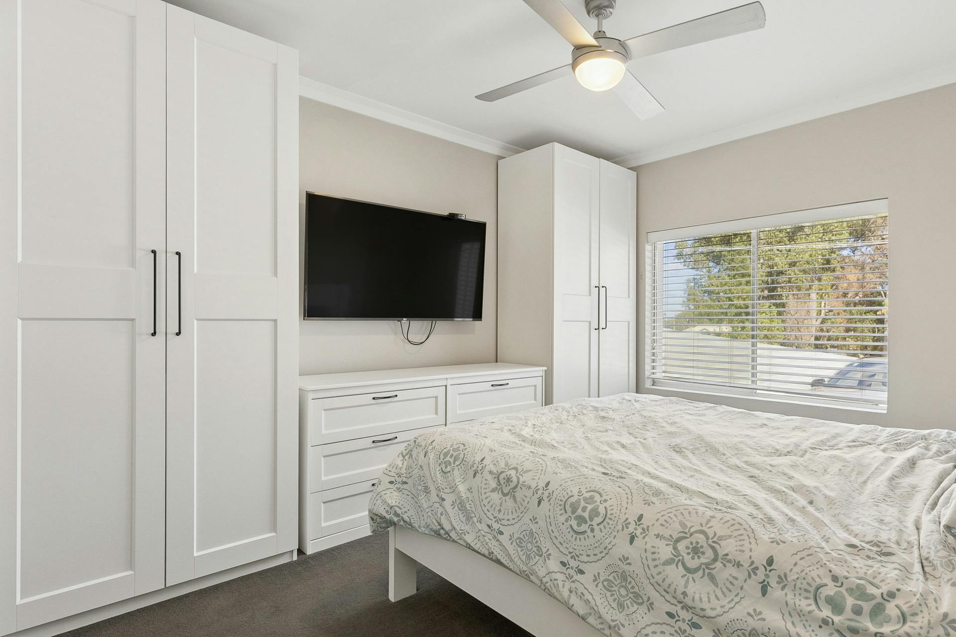 - Fantastic master suite to the front of the home, with a built-in robe, carpet underfoot and a cooling ceiling fan, with an ensuite equipped with a walk-in shower with glass screening, a vanity with storage and WC