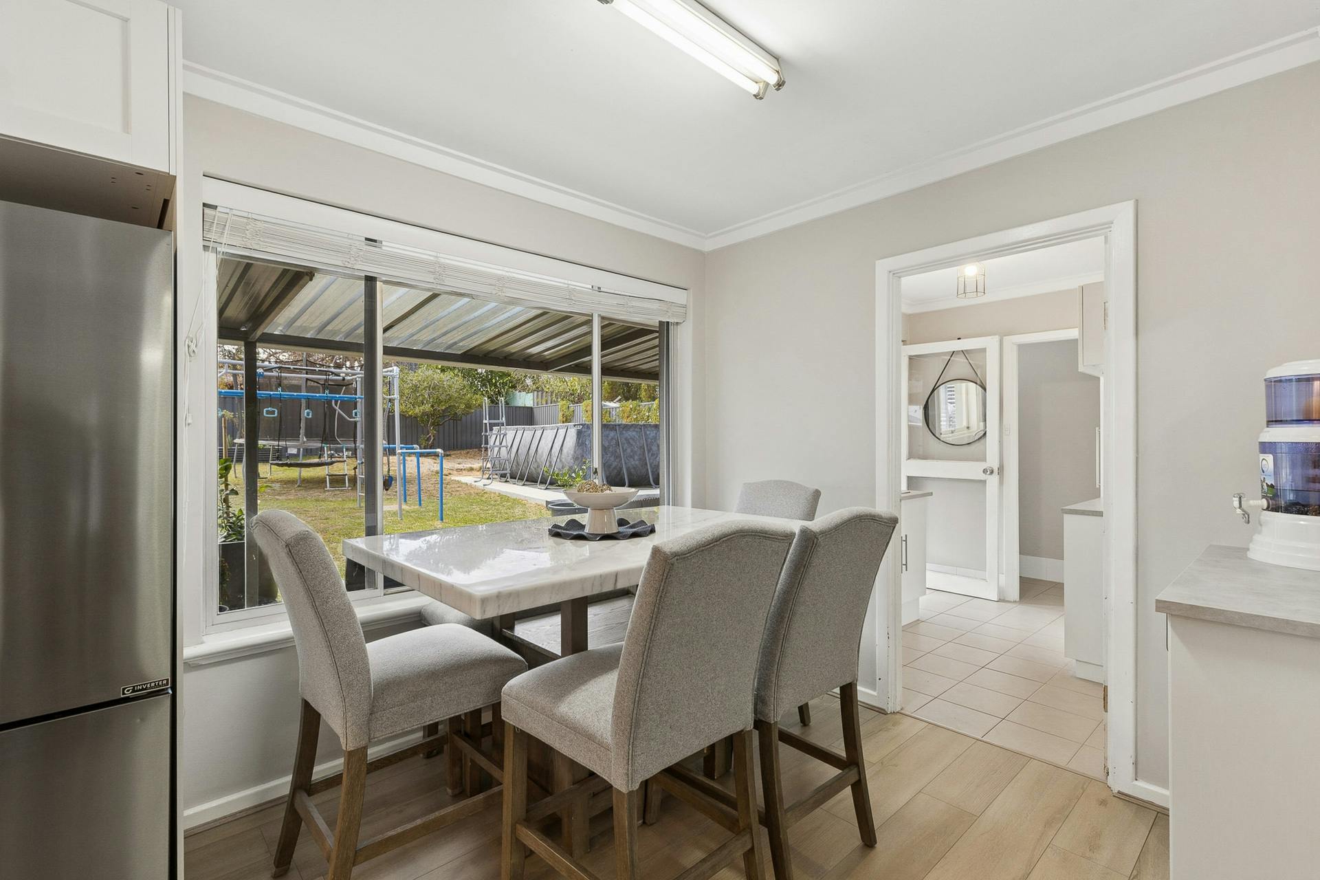 - Dining area adjacent to the kitchen for an eat-in effect, with timber effect flooring and views to the garden