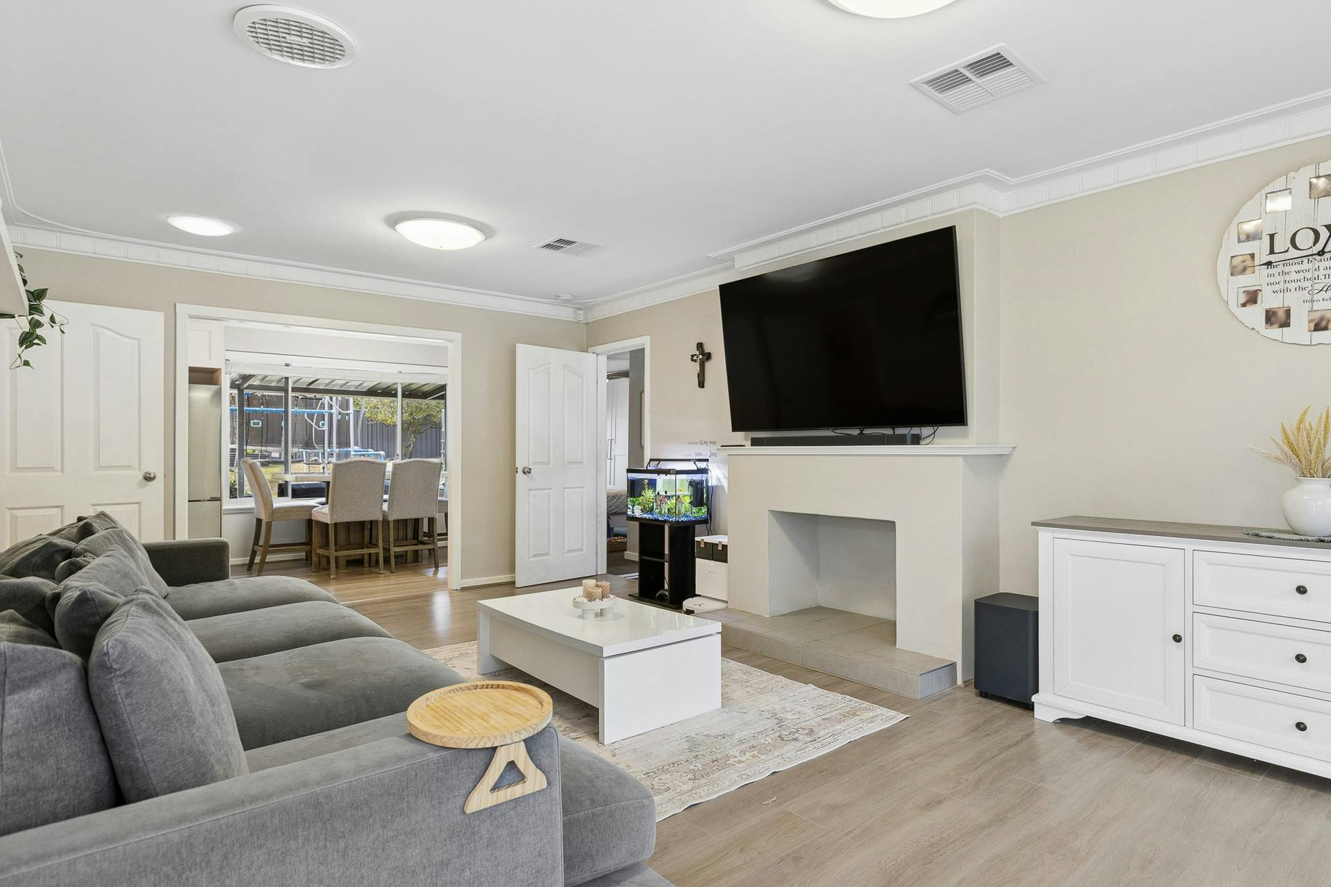 - Welcoming lounge on entry to the home, with timber effect flooring, a large picture window to enjoy the parkland views and a feature fireplace hearth within the room