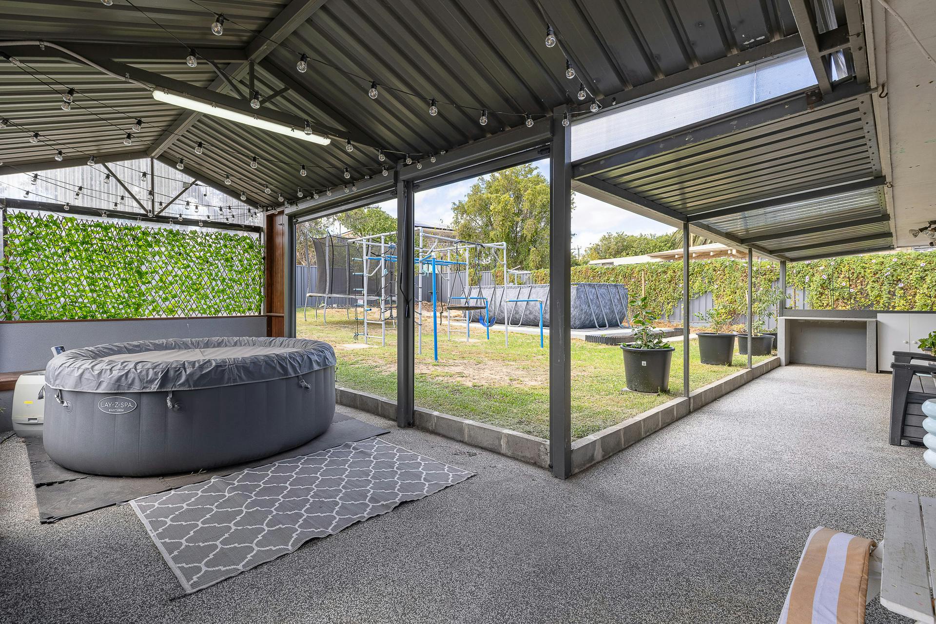 - Sweeping alfresco to the rear of the residence, with a gabled roof extension for restful relaxation or entertaining, with aggregate flooring, café blinds for enjoyment in all seasons and space to gather a crowd