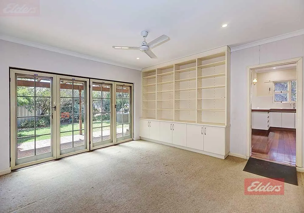 Moving through the home, you'll find a well-appointed kitchen boasting ample bench space and storage, ideal for the home cook. Adjacent is a second living area featuring built-in cabinetry and elegant French doors that open out to the patio, creating a seamless indoor-outdoor connection.
