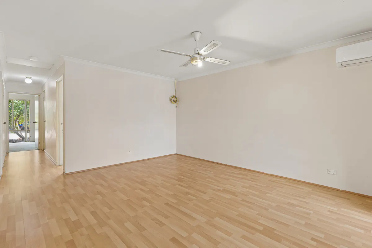 - Spacious open plan living and dining area, with timber effect flooring, a cooling ceiling fan and an effective reverse cycle air conditioning unit, with sliding doors directly to your patio beyond
