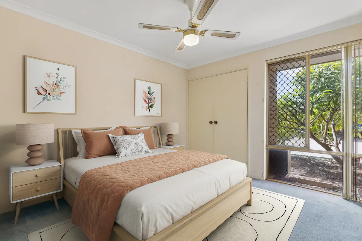 - Two well-spaced bedrooms to the front of the home, both with soft carpet and large windows for natural lighting, with a built-in robe and ceiling fan to one