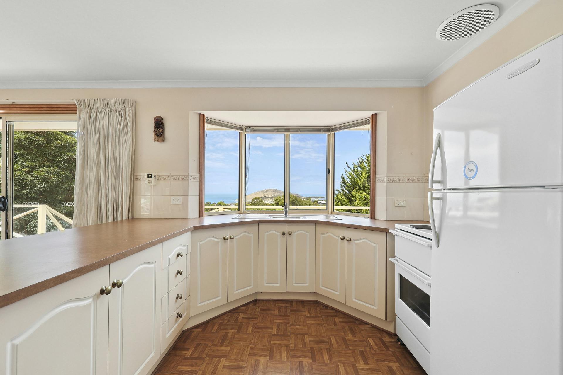 The open lounge and dining are designed with family and relaxation in mind, complete with split system air conditioning and dual sliding glass doors that open onto the homes large outdoor viewing deck and BBQ area. The kitchen is original with a modern feel, has ample bench and cupboard space, and a large picture window where you can take in the changing seasons & magnificent colours of Encounter Bay.