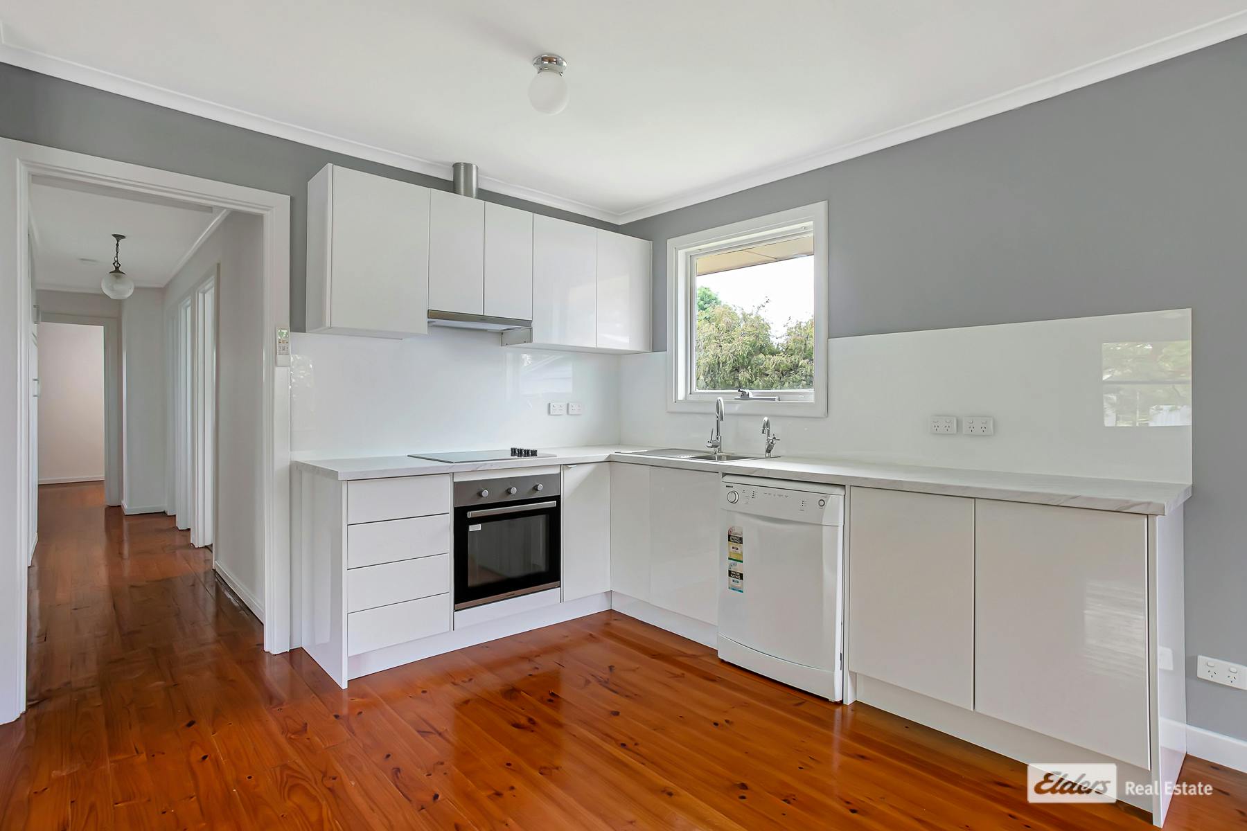 The modern kitchen adjoining the living space features electric appliances including a dishwasher, while all three bedrooms offer built-in robes and polished floorboards.