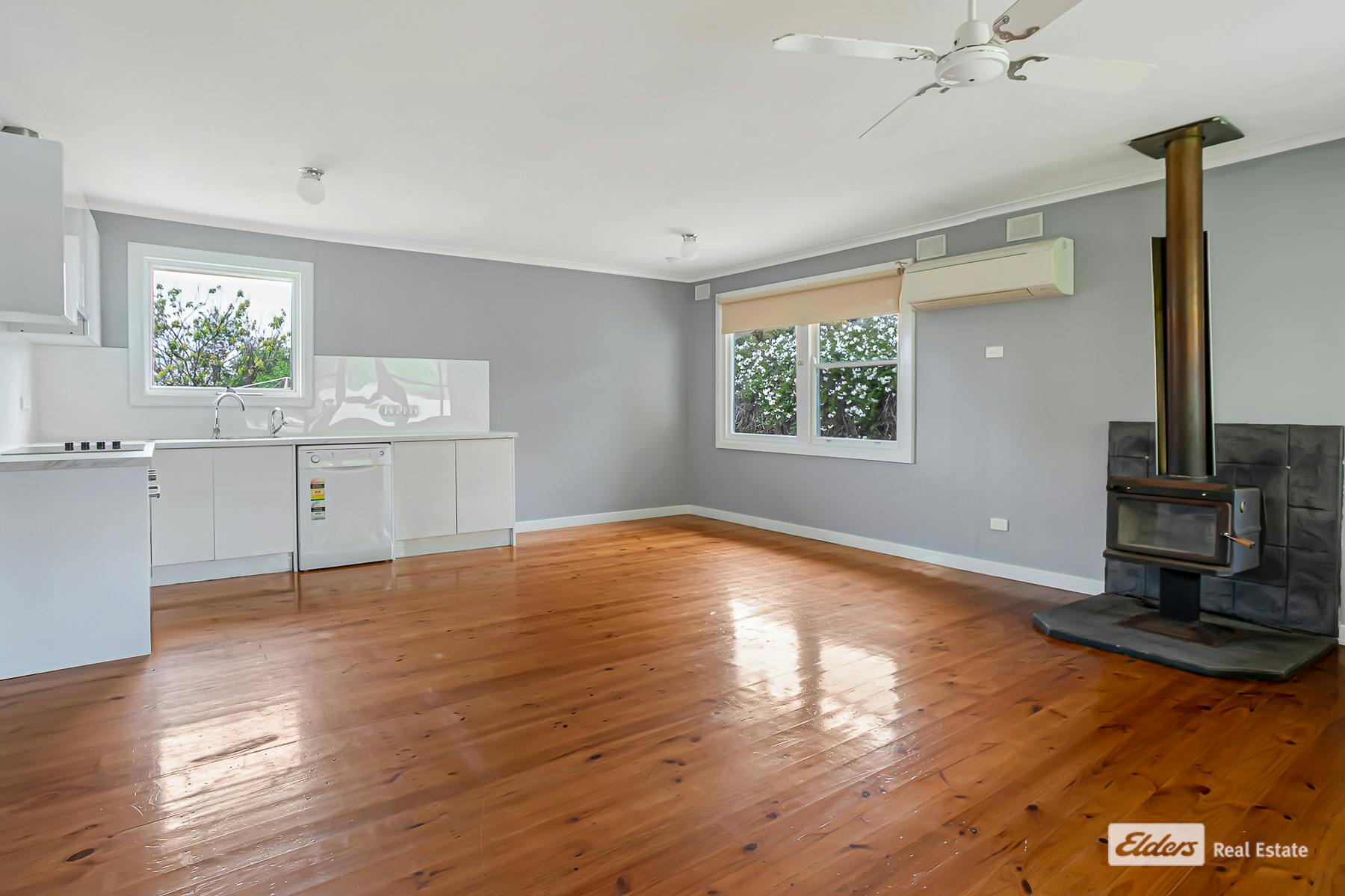 The living space is comfortable year-round with a split system, slow combustion heater, and ceiling fans, with room for a dining table as well.